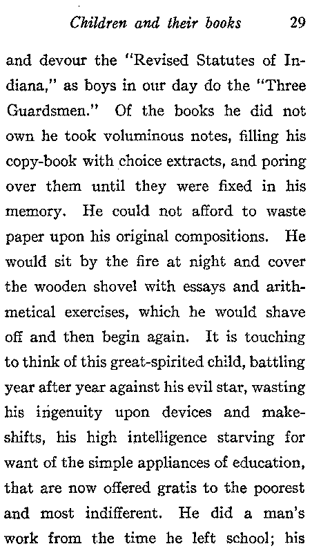 "When his tasks ended, his studies became the chief pleasure of his life. In all the intervals of his work—in which he never took delight, knowing well enough that he was born for something better than that, he read, wrote, and ciphered incessantly. His reading was naturally limited[28] by his opportunities, for books were among the rarest of luxuries in that region and time. But he read everything he could lay his hands upon, and he was certainly fortunate in the few books of which he became the possessor. It would hardly be possible to select a better handful of classics for a youth in his circumstances than the few volumes he turned with a nightly and daily hand—the Bible, "Aesop's Fables," "Robinson Crusoe," "The Pilgrim's Progress," a history of the United States, and Weem's "Life of Washington". These were the best, and these he read over and over till he knew them almost by heart. But his voracity for anything printed was insatiable. He would sit in the twilight and read a dictionary as long as he could see. He used to go to David Turnham's, the town constable,[29] and devour the "Revised Statutes of Indiana," as boys in our day do the "Three Guardsmen." Of the books he did not own he took voluminous notes, filling his copy-book with choice extracts, and poring over them until they were fixed in his memory. He could not afford to waste paper upon his original compositions. He would sit by the fire at night and cover the wooden shovel with essays and arithmetical exercises, which he would shave off and then begin again. It is touching to think of this great-spirited child, battling year after year against his evil star, wasting his ingenuity upon devices and makeshifts, his high intelligence starving for want of the simple appliances of education, that are now offered gratis to the poorest and most indifferent. He did a man's work from the time he left school; his[30] strength and stature were already far beyond those of ordinary men. He wrought his appointed tasks ungrudgingly, though without enthusiasm; but when his employer's day was over his own began."