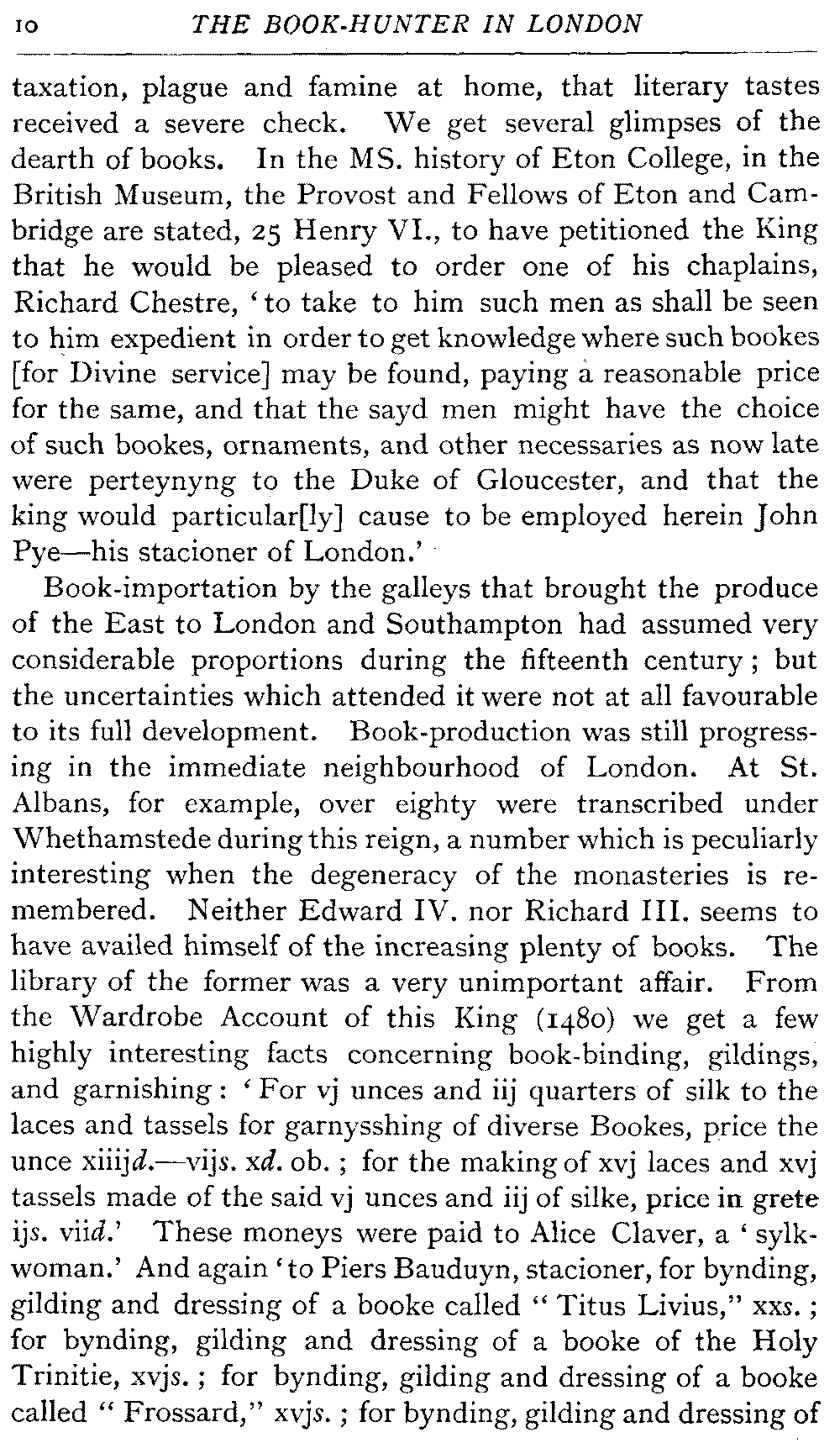 THOSE who have studied the earlier phases of English history will readily understand that the terms book-hunting in England and book-hunting in London are by no means synonymous. The passion for books had manifested itself in various and remote parts of this country long before London had developed into a place of importance; when, indeed, it was battling from without and within with conflicts which seemed to predict complete annihilation. But the growth of London is essentially typical of the growth of the nation, and of the formation of the national character. When it was laying the foundation of its future greatness London had no thought of intellectual pursuits, even if Londoners themselves had any conception of an intellectual life. For any trace of such unthought-of, and perhaps, indeed, unheard-of, articles as books, we must go to localities far remote from London—to spots where, happily, the strife [2]and din of savage warfare scarcely made themselves heard. The monasteries were the sole repositories of literature; to the monk alone had the written book any kind of intelligence, any species of pleasure. To him it was as essential as the implements of destruction to the warrior, or the plough to the husbandman. The one had no sympathy, no connection, with the other, only in so far that the events which transpired in the battlefield had to be recorded in the scriptorium. Although London was a place of importance at a very early stage of the Roman occupation, it was not in any sense an intellectual centre for centuries after that period.