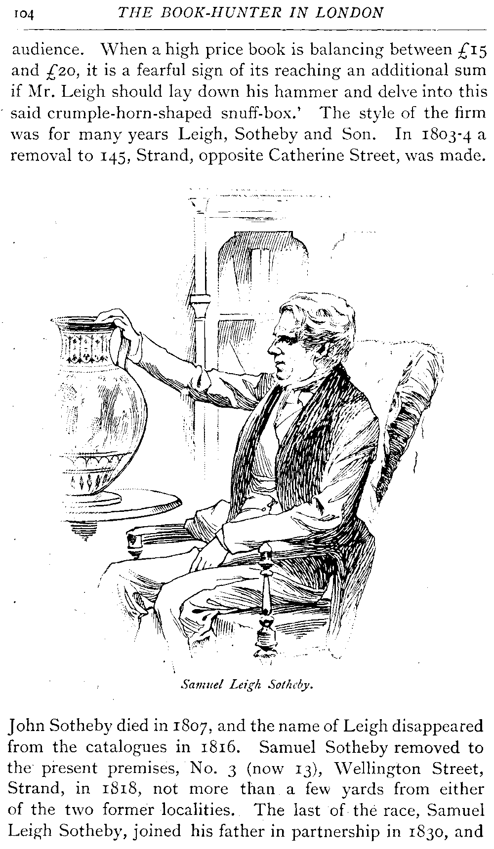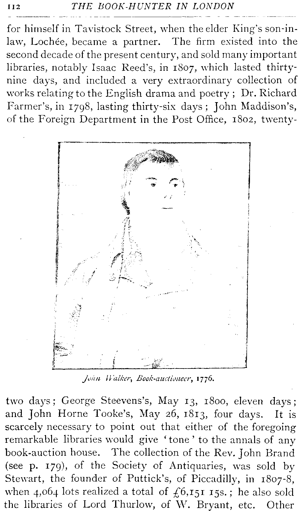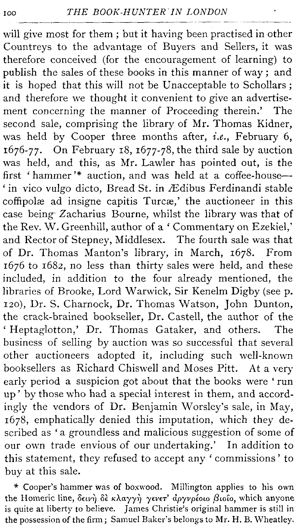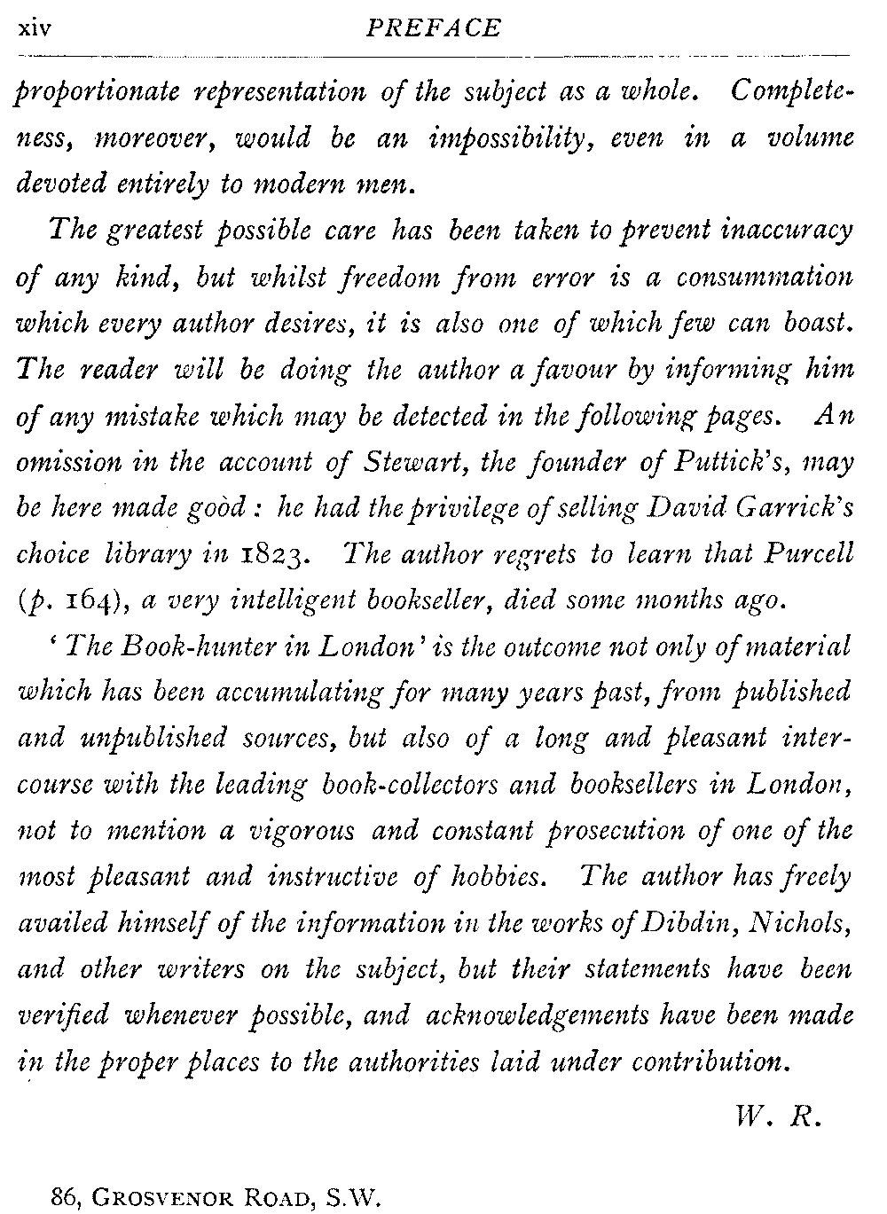 The greatest possible care has been taken to prevent inaccuracy of any kind, but whilst freedom from error is a consummation which every author desires, it is also one of which few can boast. The reader will be doing the author a favour by informing him of any mistake which may be detected in the following pages. An omission in the account of Stewart, the founder of Puttick's, may be here made good: he had the privilege of selling David Garrick's choice library in 1823. The author regrets to learn that Purcell (p. 165), a very intelligent bookseller, died some months ago.