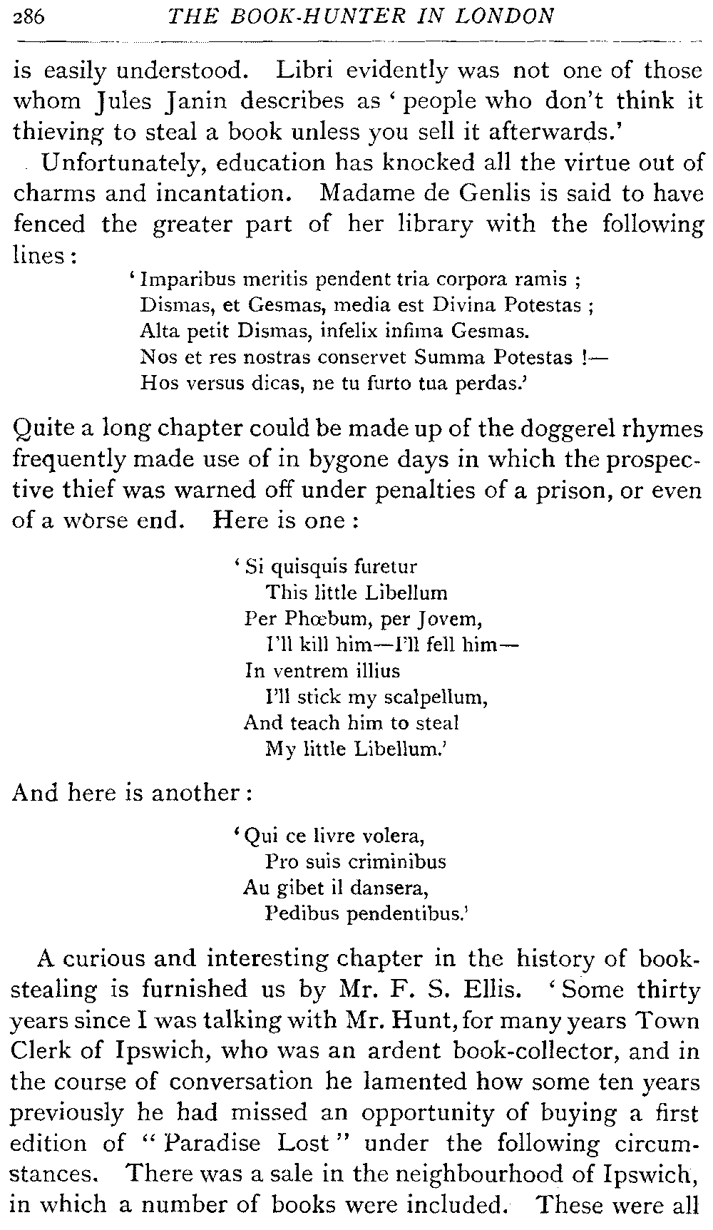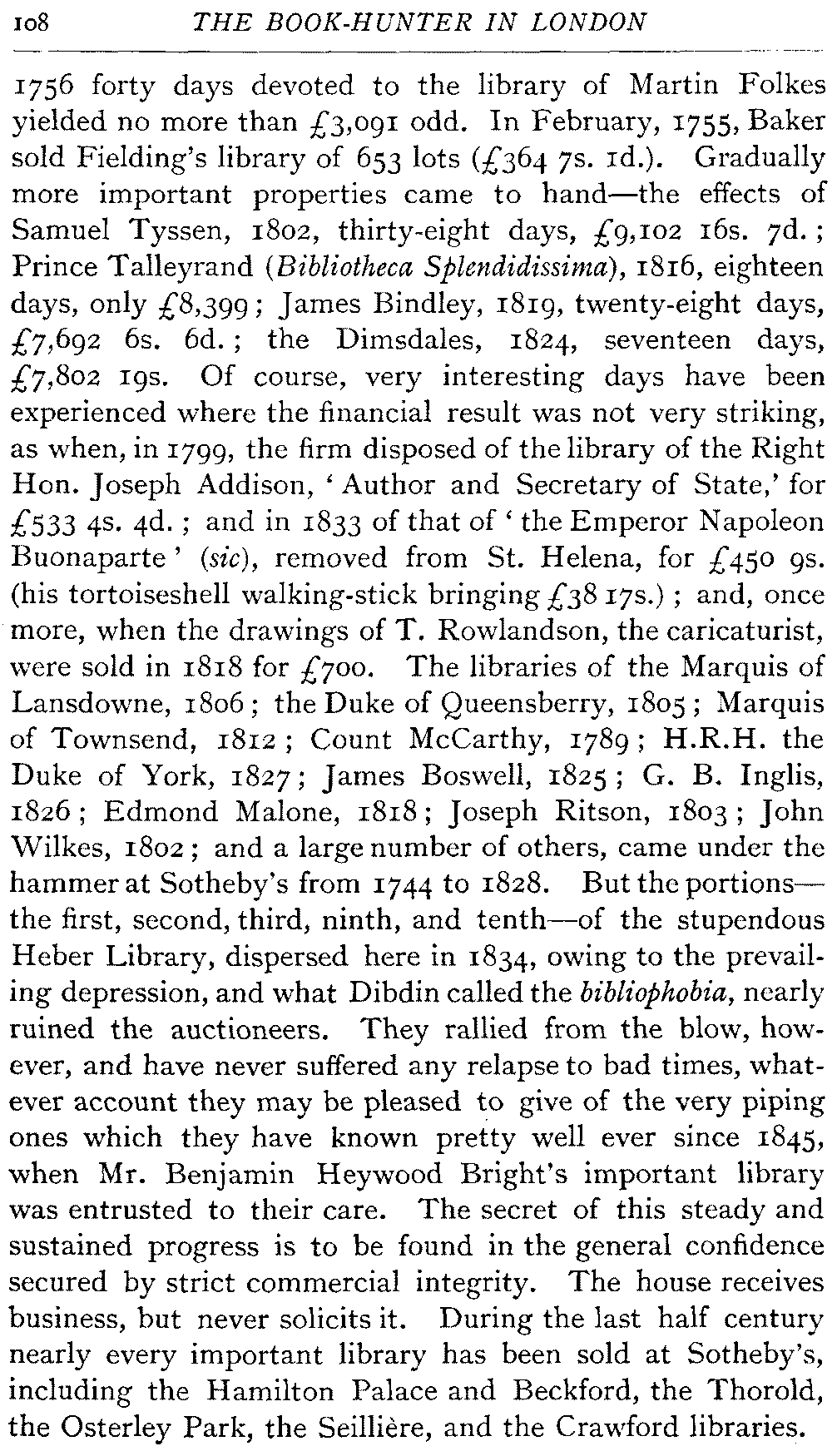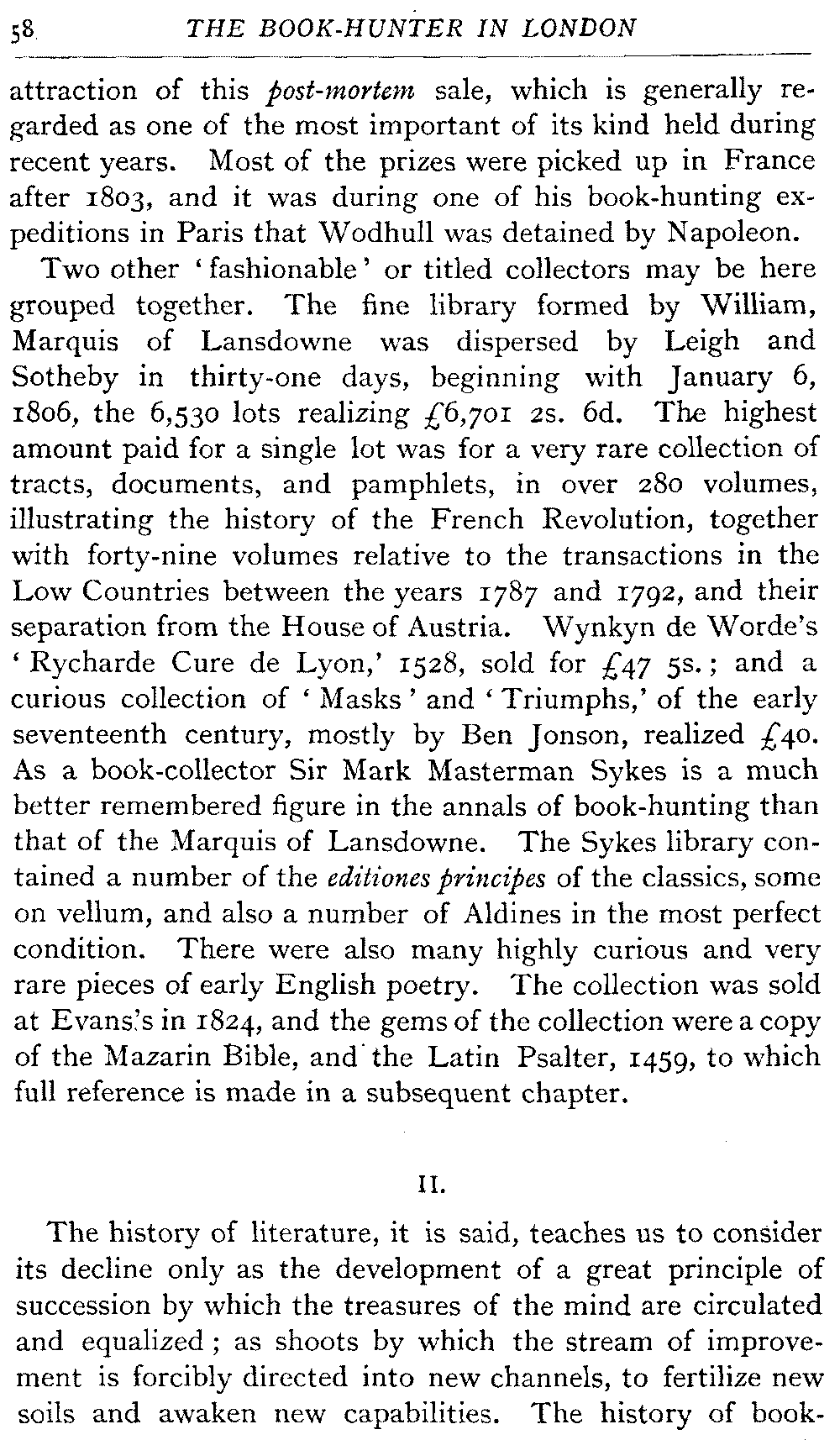 Half a century ago one of the most inveterate frequenters of book-auctions was a certain Dr. G., of diminutive stature, on account of an awkward deviation of the spine. At that time the appearance of a private purchaser at a sale was a very rare event, and one which, when it occurred, invariably met with a more or less hostile reception from the fraternity. Dr. G.'s first appearance produced a good deal of sensation. The hunchback, it is true, was rather shabbily dressed, but 'l'habit ne fait pas le moine,' and is certainly no trustworthy index to the pockets of the wearer. Excitement reached fever-heat when a Wynkyn de Worde was put up and persistently contested for by the doctor, who ran it up against the booksellers present (some of whom quickly desisted from the fun for fear of burning their fingers), one of whom, far exceeding his commission, obstinately refused to give in until the book was knocked down to him to his own dismay, and the delight and ironical compliments of his colleagues. After this contretemps the doctor had it pretty much his own way; his name was duly entered on the sale catalogue, and his address was known. The next day our bookseller, sobered by reflection, called on the doctor, confessed his sin of the previous day, humbly asked for absolution, and offered him the book at an immense loss on the sale price. 'If you were,' replied the doctor, 'to bring the book at my door for nothing, I would take it with a pair of tongs and drop it into the gutter.' It was a puzzle to everyone what the little doctor did with all his purchases, which were limited chiefly to classical books. At [xxx]his death, however, it transpired that he bought for the various Universities of the United Kingdom. The doctor's son, a poor curate, entered his late father's library for the first time, and found there a mass of books, which occupied nearly a month in selling, and realized, to his delight, a large sum of money.