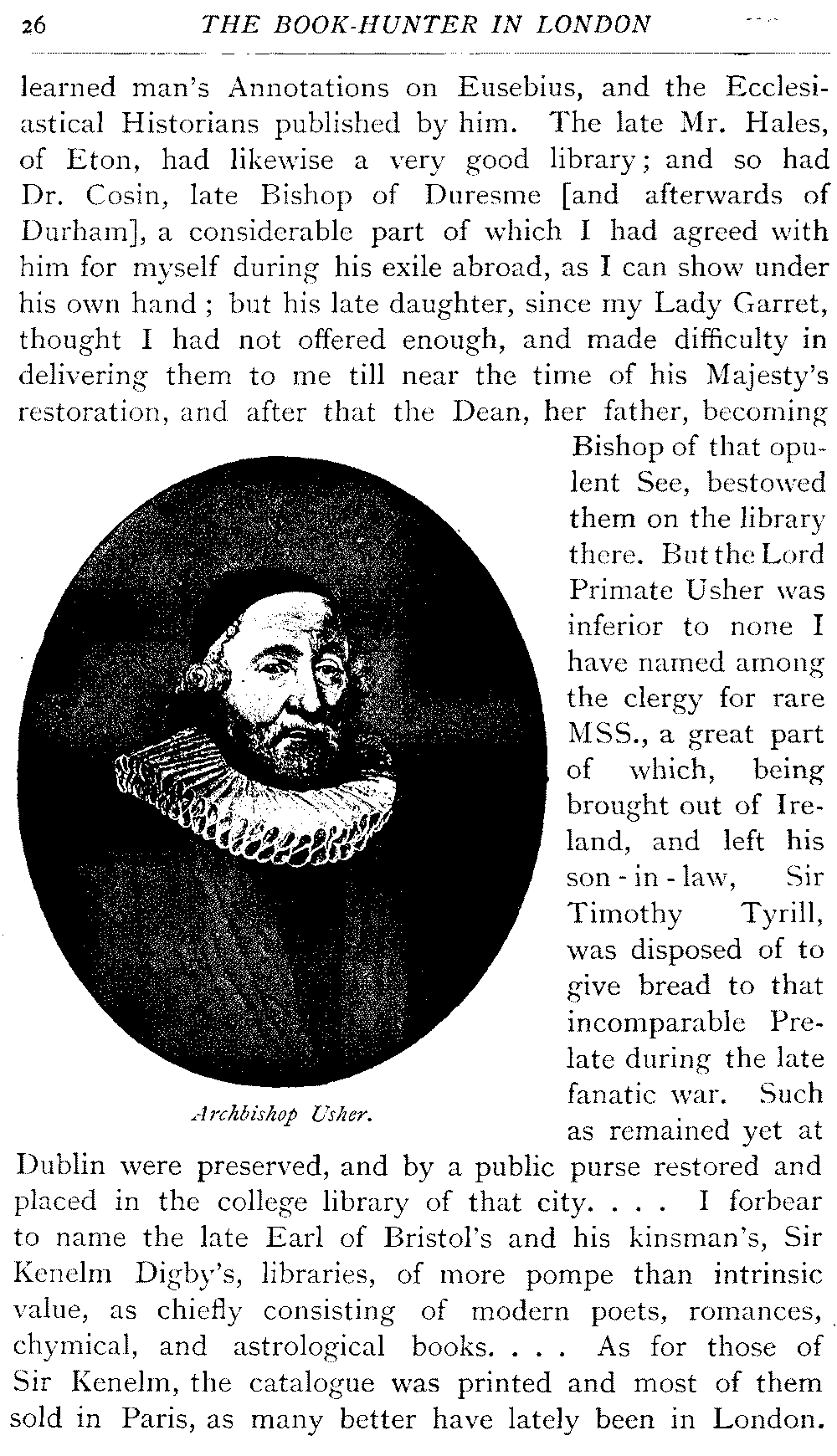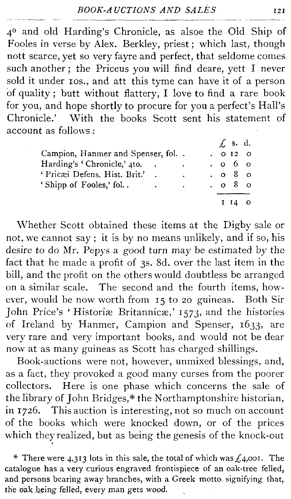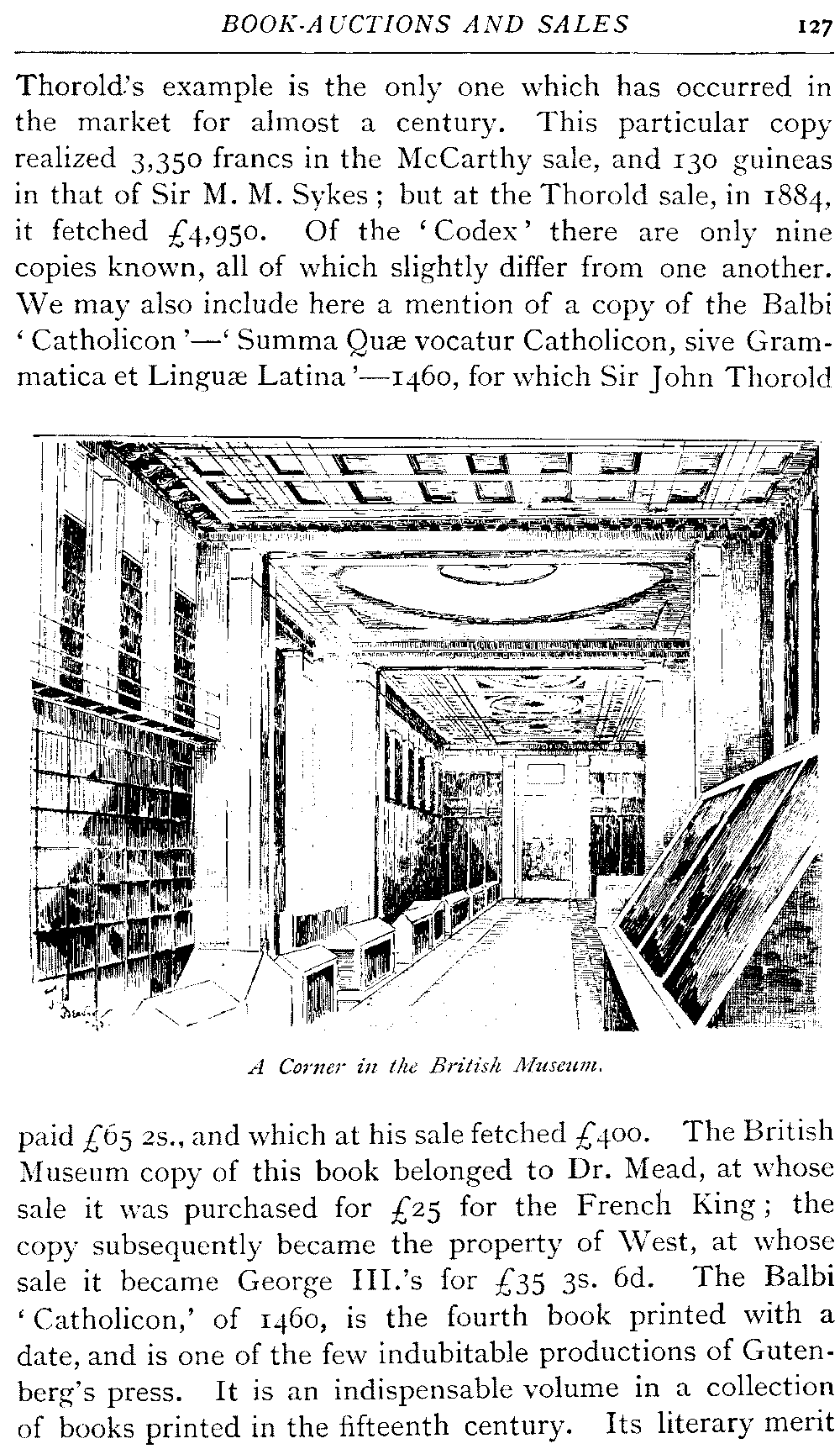 Half a century ago one of the most inveterate frequenters of book-auctions was a certain Dr. G., of diminutive stature, on account of an awkward deviation of the spine. At that time the appearance of a private purchaser at a sale was a very rare event, and one which, when it occurred, invariably met with a more or less hostile reception from the fraternity. Dr. G.'s first appearance produced a good deal of sensation. The hunchback, it is true, was rather shabbily dressed, but 'l'habit ne fait pas le moine,' and is certainly no trustworthy index to the pockets of the wearer. Excitement reached fever-heat when a Wynkyn de Worde was put up and persistently contested for by the doctor, who ran it up against the booksellers present (some of whom quickly desisted from the fun for fear of burning their fingers), one of whom, far exceeding his commission, obstinately refused to give in until the book was knocked down to him to his own dismay, and the delight and ironical compliments of his colleagues. After this contretemps the doctor had it pretty much his own way; his name was duly entered on the sale catalogue, and his address was known. The next day our bookseller, sobered by reflection, called on the doctor, confessed his sin of the previous day, humbly asked for absolution, and offered him the book at an immense loss on the sale price. 'If you were,' replied the doctor, 'to bring the book at my door for nothing, I would take it with a pair of tongs and drop it into the gutter.' It was a puzzle to everyone what the little doctor did with all his purchases, which were limited chiefly to classical books. At [xxx]his death, however, it transpired that he bought for the various Universities of the United Kingdom. The doctor's son, a poor curate, entered his late father's library for the first time, and found there a mass of books, which occupied nearly a month in selling, and realized, to his delight, a large sum of money.