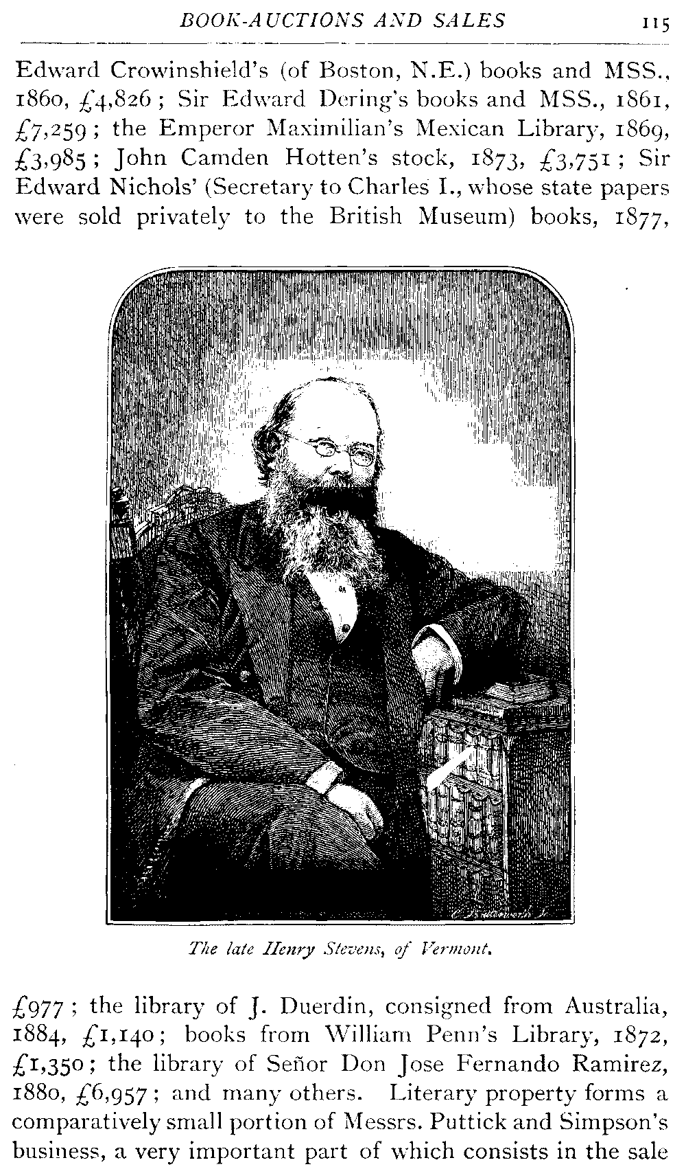 The subject of book-finds is one about which a volume might be written. Every 'special' collector has his fund of book-hunting anecdotes and incidents, for, where the rarity of a well-known [xxv]book is common property, there is not usually much excitement in running it to earth. The fun may be said to begin when two or three people are known to be on the hunt after a rare and little-known volume, whose interest is of a special character. To take, as an illustration, one of the most successful book-hunters of modern times, the late Henry Stevens, of Vermont. Until Mr. Stevens created the taste for Americana among his fellow-countrymen, very few collectors considered the subject worth notice. And yet, in the space of a quarter of a century, he unearthed more excessively rare and unique items than the wildest dreamer could have supposed to exist. Books and pamphlets which were to be had for the proverbial old song when he first came to this country quickly became the objects of the keenest competition in the saleroom, and invariably found buyers at extravagant prices. As an illustration, although not an American item, we may mention that when a copy of the Mazarin Bible was offered at Sotheby's in 1847, the competitors were an agent of Mr. James Lenox (Stevens' client) and Sir Thomas Phillipps in person; the latter went to £495, but the agent went £5 better, and secured the prize at the then unheard-of price of £500. At first Mr. Lenox declined to take the book, but eventually altered his mind, wisely as it proved, for although at long intervals copies are being unearthed, the present value of Mr. Lenox's copy cannot be much short of £4,000. During 1854 and 1855 Mr. Stevens bought books to the value of over 50,000 dollars for Mr. Lenox, and on reviewing the invoices of these two years, 'I am confident,' says Mr. Stevens, 'that, if the same works were now' (1887) 'to be collected, they would cost more than 250,000 dollars. But can so much and so many rare books ever be collected again in that space of time?' In December, 1855, Mr. Stevens offered Mr. Lenox in one lump about forty Shakespeare quartos, all in good condition, and some of them very fine, for £500, or, including a fair set of the four folios, £600, an offer which was accepted, and it may be doubted whether such a set could now be purchased for £6,000. Mr. Lenox was for over ten years desirous of obtaining a perfect copy of 'The Bay Psalter,' printed by Stephen Daye at Cambridge, New England, 1640, the first book printed in what is now the United States, and had given Mr. Stevens a commission of £100 for it. After searching far and wide, the long-lost 'Benjamin' was discovered in a lot [xxvi]at the sale of Pickering's stock at Sotheby's in 1855. 'A cold-blooded coolness seized me, and advancing towards the table behind Mr. Lilly, I quietly bid, in a perfectly neutral tone, "Sixpence"; and so the bids went on, increasing by sixpences, until half a crown was reached and Mr. Lilly had loosened the string. Taking up this very volume, he turned to me and remarked, "This looks a rare edition, Mr. Stevens; don't you think so? I do not remember having seen it before," and raised the bid to 5s. I replied that I had little doubt of its rarity, though comparatively a late edition of the Psalms, and at the same time gave Mr. Wilkinson a sixpenny nod. Thenceforward a "spirited competition" arose between Mr. Lilly and myself, until finally the lot was knocked down to Stevens for 19s.' The volume had cost the late Mr. Pickering 3s. It became Mr. Lenox's property for £80. Twenty-three years later another copy was bought by Mr. Cornelius Vanderbilt for 1,200 dollars.