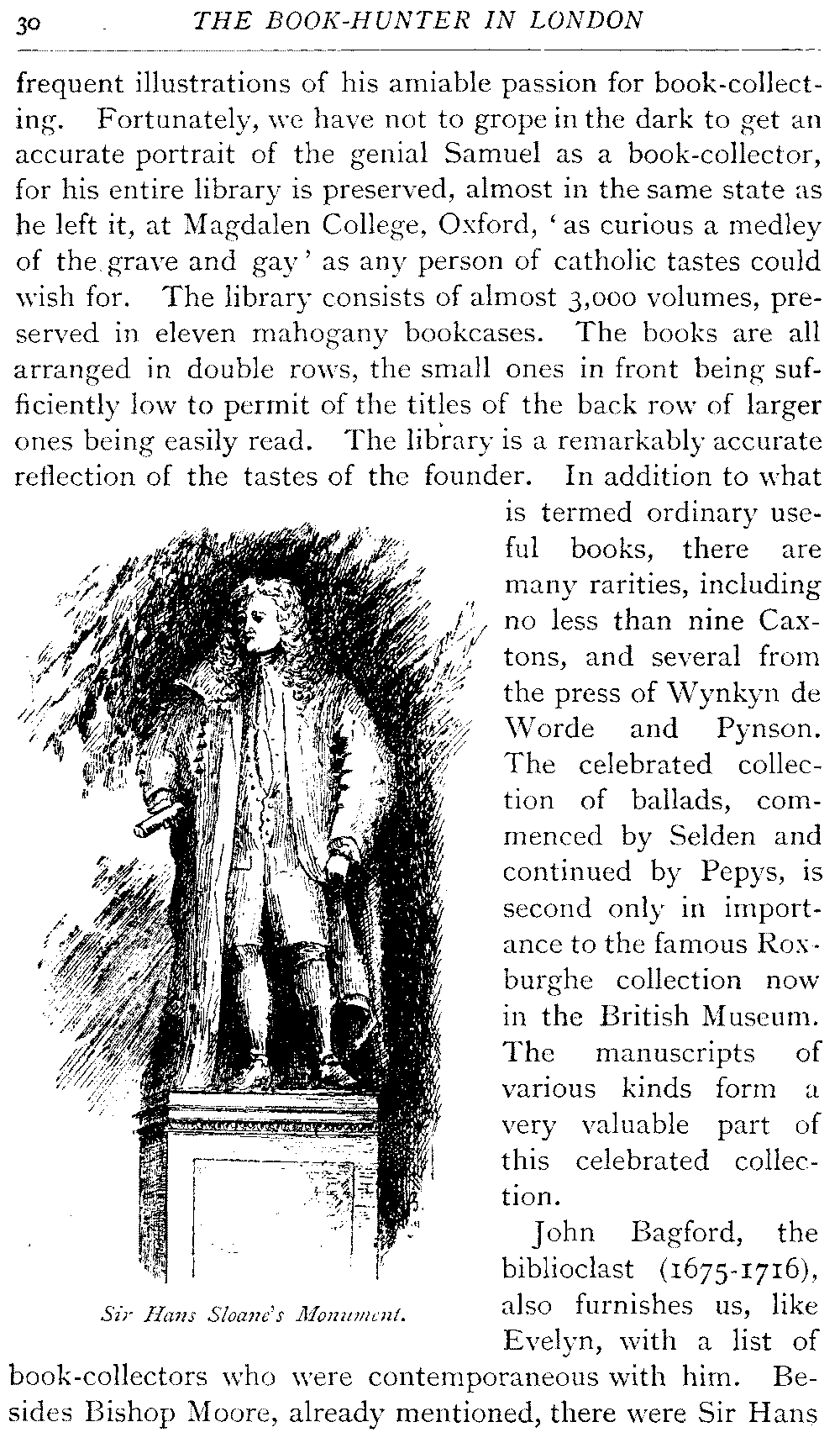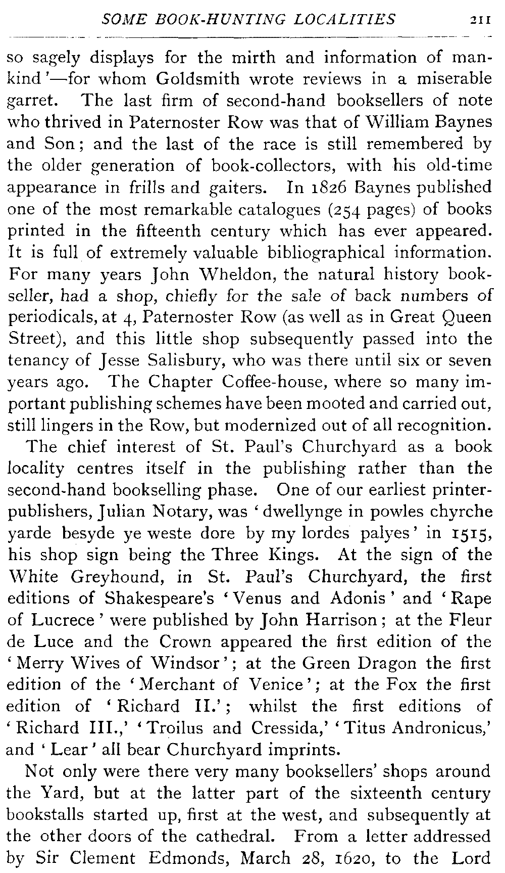 Scarcely any such thing as book-hunting or book-selling could possibly have existed in London before the accession of [3]Alfred, who, among the several ways in which he encouraged literature, is said to have given an estate to the author of a book on cosmography. Doubtless, it was after the rebuilding of the city by Alfred that, in the famous letter to Wulfseg, Bishop of London, he takes a retrospective view of the times in which they lived, as affording 'churches and monasteries filled with libraries of excellent books in several languages.' Bede describes London, even at the beginning of the eighth century, as a great market which traders frequented by land and sea; and from a passage in Gale we learn that books were brought into England for sale as early as 705. With the reconstruction of London, the wise government, and the enthusiastic love for letters which animated the great Saxon King, the commerce of the capital not only increased with great rapidity, but the commerce in books between England and other countries, particularly from such bibliopolic centres as Paris and Rome, began to assume very considerable proportions. If, as is undoubtedly the case, books were continually being imported, it follows that they found purchasers. By the beginning of the eleventh century there were many private and semi-private collections of books in or near London. The English book-collectors of the seventh century include Theodore, Archbishop of Canterbury, Benedict, Abbot of Wearmouth, and Bede; those of the eighth century, Ina, King of the West Saxons, and Alcuin, Abbot of Tours; whilst the tenth century included, in addition to Alfred, Scotus Erigena, Athelstan, and St. Dunstan, Archbishop of Canterbury.