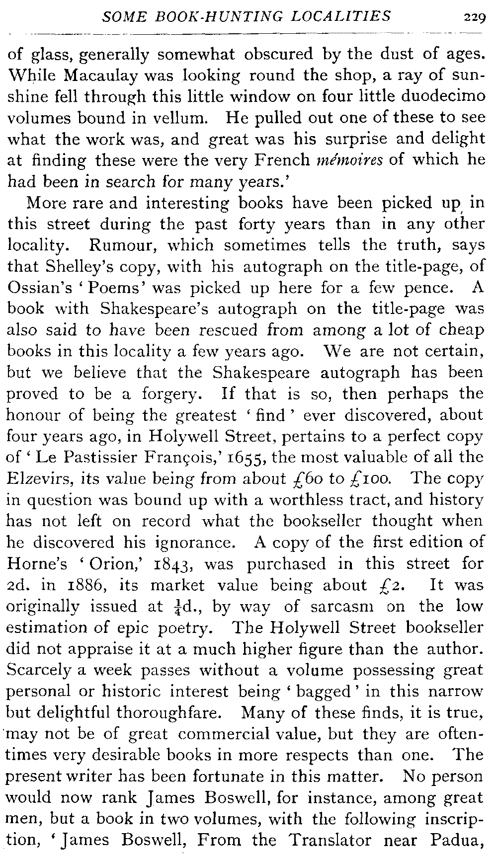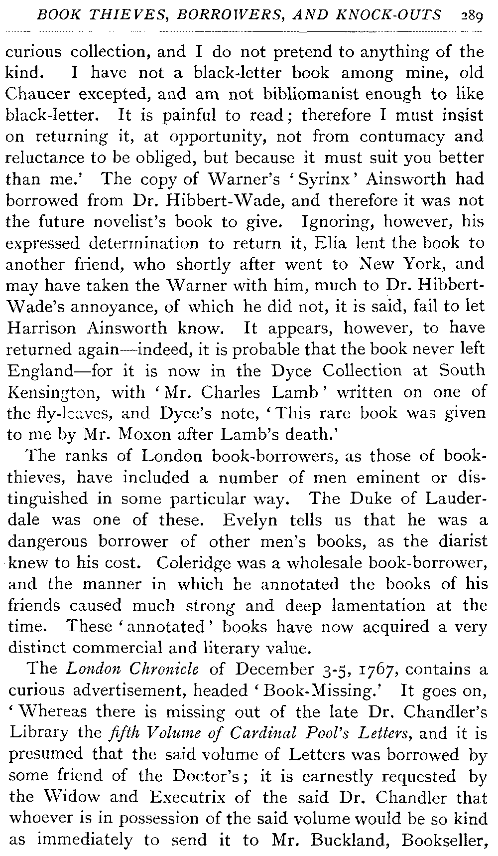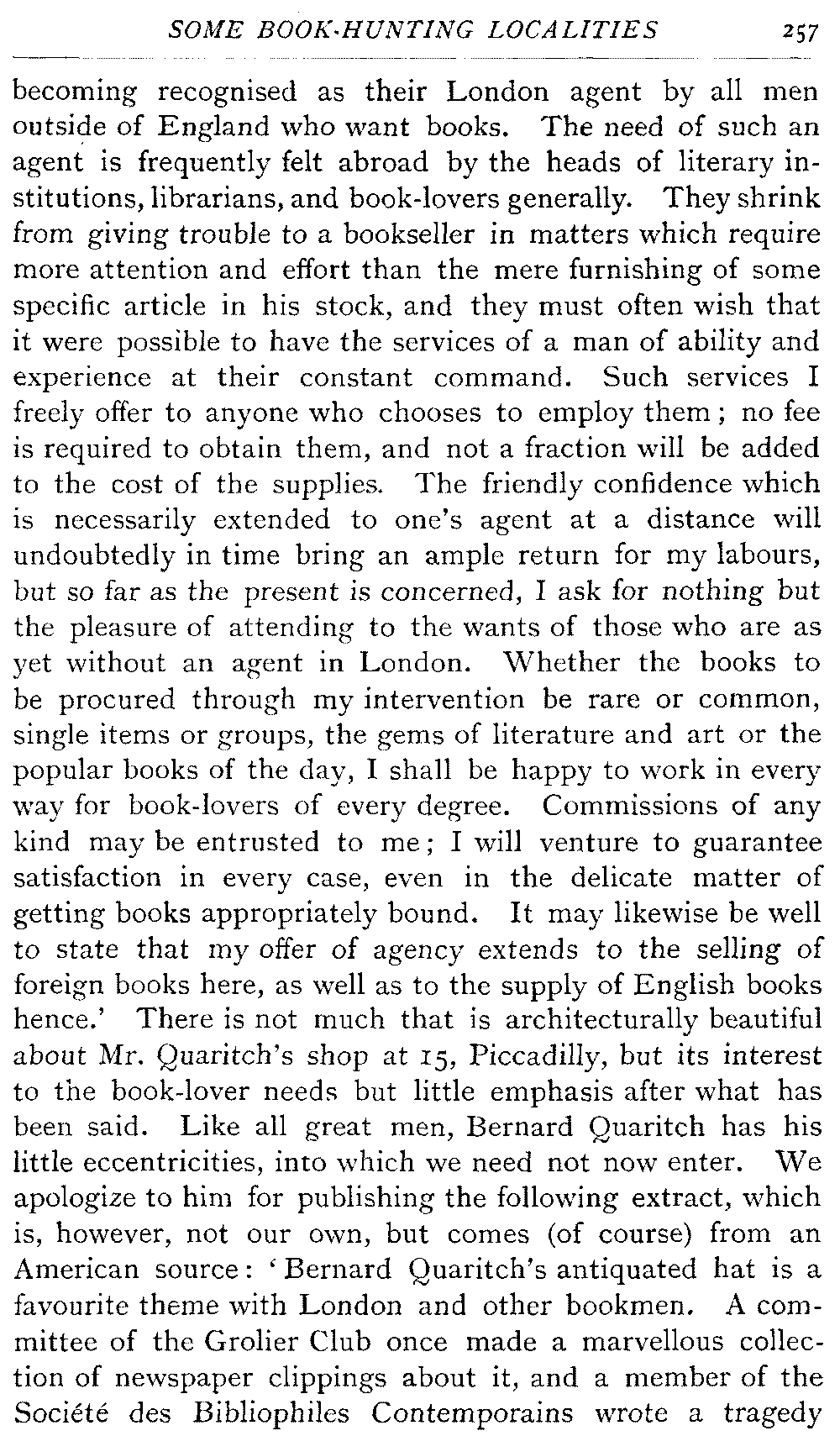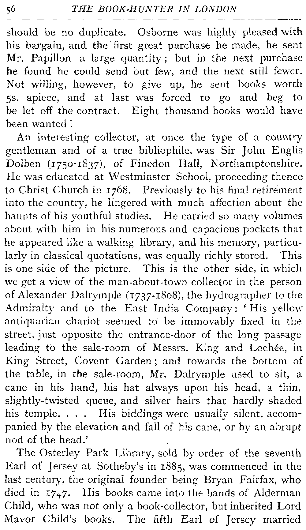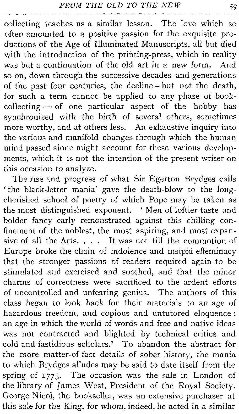 The contempt with which Dr. G. received the bookseller's proposal is peculiarly typical of the book-collector. If he cannot obtain what he wants just exactly when he wants it, he does not care about it. The book-collector is doubtless too prone to despise everything which is not quite in his line, forgetting that all branches of literature contribute in some degree, greater or lesser, to the bulk of human knowledge. No man can be universal, even if he had the wealth of a dozen Rothschilds, or the mental vigour and versatility of a hundred Gladstones.