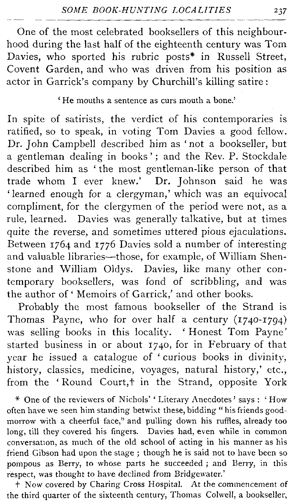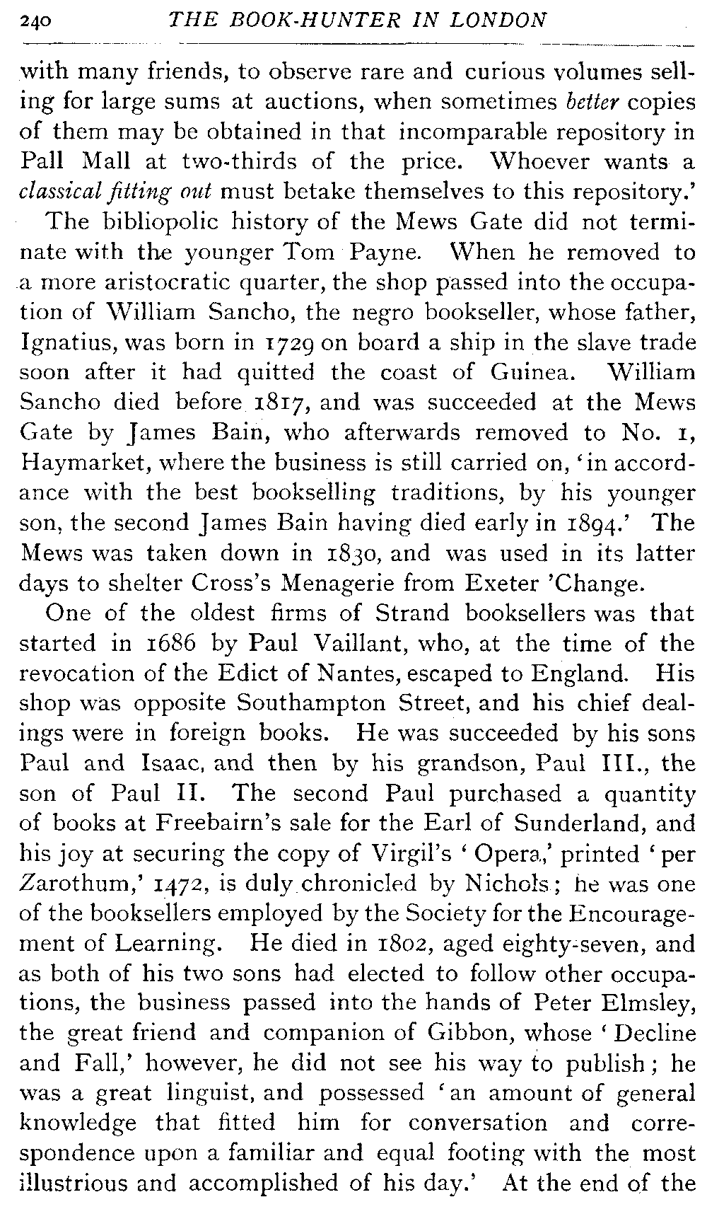 Cousin Pons and Don Vincente are extreme instances of bibliomaniacs to whom the possession of a book was the supreme happiness of life. The man of Fiction and the man of Fact were at one in this passion of acquisitiveness. Don Vincente was compelled by hunger—mala suada fames—to become a book seller; and if it became a general rule for book-collectors to become booksellers there would, we venture to think, be a very material increase in police-court and, perhaps, criminal cases generally. Mr. G. A. Sala tells us an amusing story of the late Frederick Guest Tomlins, a historian and journalist of repute. In the autumn of his life Tomlins decided to set up as a bookseller. He purposed to deal chiefly in mediæval literature, in which he was profoundly versed. The venture was scarcely successful. A customer entered his shop one day and asked for a particular book, as marked in the catalogue. 'I had really no idea it was there,' meditatively remarked Mr. Tomlins, as he ascended a ladder to a very high shelf and pulled out a squabby little tome. Then he remained about five-and-twenty minutes on the ladder absorbed in the perusal of the volume, when the customer, growing impatient, began to rap on the counter with his stick. Thereupon Mr. Tomlins came down the ladder. 'If you think,' he remarked, with calm severity, to the intending purchaser, 'that any considerations of vile dross will induce me to part with this rare and precious little volume, you are very much mistaken. It is like your impudence. Be off with you!' A not altogether dissimilar anecdote is related by Lord Lytton in that curious novel 'Zanoni,' in which one of the characters is an old bookseller who, after years of toil, succeeded in forming an almost perfect library of works on occult philosophy. Poor in everything but a genuine love for the mute companions of his old age, he was compelled to keep open his shop, and trade, as it were, in his own flesh. Let a customer enter, and his countenance fell; let him depart empty-handed, and he would smile gaily, oblivious for a time of bare cupboard and inward cravings.