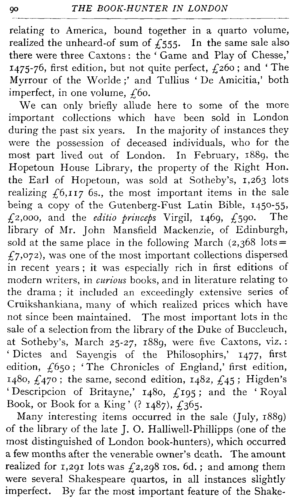 In a letter to Justin Windsor, the late J. Orchard Halliwell-Phillipps gave some very curious and interesting information respecting book-collecting in the earlier half of the present century. 'About the year 1836,' he wrote, 'when I first began hunting for old books at the various stalls in our famous London city, black-letter ones and rare prints were "plenty as blackberries," and I have often found such things in unlikely places and amidst a mass of commonplace rubbish, exposed for sale in boxes labelled, "These books and pamphlets 6d. or 1s. each," outside an old bookseller's window, where another notice informed the passer-by that "Libraries were purchased or books bought;" and thus plainly showed how such now indeed rarities came into the possession of an ignorant bibliopole. It was not, however, till about 1840 that I turned my attention to the more special work of collecting Shakespeare quartos, in which, I may say, I have been very successful. It was at one of George Chalmers' sales that I first bought one or two, and after that I hunted for them in all parts of the country, and met with considerable success, often buying duplicates, and even triplicates, of the same edition and play. At one time I possessed no less than three copies of the very rare quarto edition of "Romeo and Juliet," 1609, and sometimes even had four copies of more than one of the other quartos. Not so very long before this period, old Jolley, the well-known collector, picked up a Caxton [xxvii]at Reading, and a "Venus and Adonis," 1594, at Manchester, in a volume of old tracts, for the ignoble sum of 1s. 3d. Jolley was a wealthy orange-merchant of Farringdon Street, London, and entertained me often with many stories of similar fortunate finds of rare books, which served to whet my appetite only the more. But I was soon stopped in my book-hunting career by the appearance all at once on the scene of a number of buyers with much longer purses than my own, and thus I was driven from a market I had derived so much pleasure from with great regret. Some time afterwards circumstances rendered it desirable that I should part with a large number of my book-treasures by auction and to the British Museum; but even then I retained enough to be instrumental in founding the first Shakespearian library in Scotland, by presenting to the University of Edinburgh, amongst other rarities, nearly fifty copies of original quartos of Shakespeare's plays, printed before the Restoration, and to keep sufficient myself of the rarest and most valuable examples.'