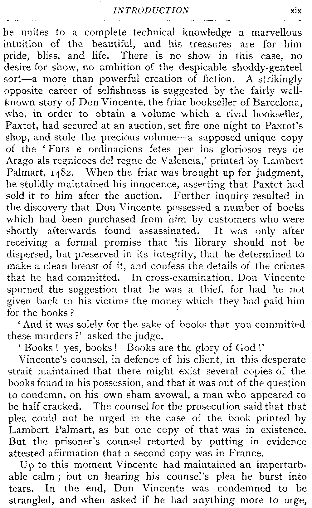 Another type which borders dangerously near to that which we have been describing is the collector who, not necessarily ignorant, collects for himself alone. The motto which Grolier adopted and acted upon—'Io Grolierii et amicorum'—might have been a very safe principle to go upon in the sixteenth century, but it would most certainly fail in the nineteenth, when one's dearest friends are the most unmitigated book-thieves. But perhaps even the too frequent loss of books is an evil to be preferred to the egoistical meanness of the selfish collector. Balzac gives in his 'Cousin Pons' a vivid delineation of such a person. The hero is a poor drudging music-teacher and orchestra-player, who has invested every franc of his hard-won earnings in the collecting of exquisite paintings, prints, bric-à-brac, and other rare mementoes of the eighteenth century. Despised by all, even by his kindred, trodden upon as a nobody, slow, patient, and ever courageous, [xix]he unites to a complete technical knowledge a marvellous intuition of the beautiful, and his treasures are for him pride, bliss, and life. There is no show in this case, no desire for show, no ambition of the despicable shoddy-genteel sort—a more than powerful creation of fiction. A strikingly opposite career of selfishness is suggested by the fairly well-known story of Don Vincente, the friar bookseller of Barcelona, who, in order to obtain a volume which a rival bookseller, Paxtot, had secured at an auction, set fire one night to Paxtot's shop, and stole the precious volume—a supposed unique copy of the 'Furs e ordinacions fetes per los gloriosos reys de Arago als regnicoes del regne de Valencia,' printed by Lambert Palmart, 1482. When the friar was brought up for judgment, he stolidly maintained his innocence, asserting that Paxtot had sold it to him after the auction. Further inquiry resulted in the discovery that Don Vincente possessed a number of books which had been purchased from him by customers who were shortly afterwards found assassinated. It was only after receiving a formal promise that his library should not be dispersed, but preserved in its integrity, that he determined to make a clean breast of it, and confess the details of the crimes that he had committed. In cross-examination, Don Vincente spurned the suggestion that he was a thief, for had he not given back to his victims the money which they had paid him for the books?