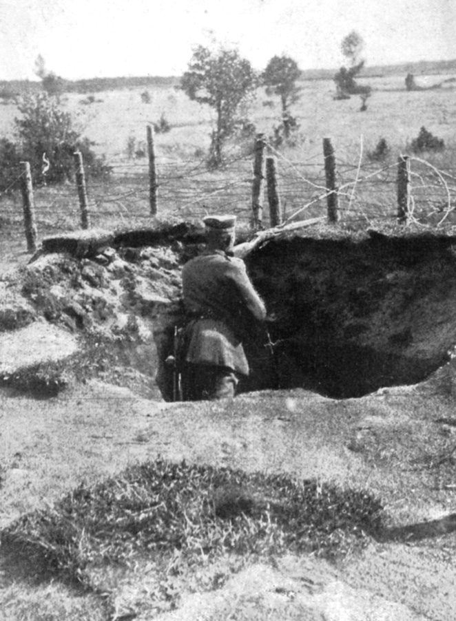 Deutscher Einzelposten hinter Drahtverhau im Westen.