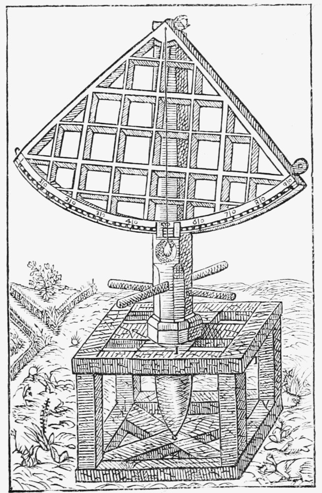 His next advance in instrumental equipment was to provide himself with the contrivance known as the "cross-staff," which he used to observe the stars whenever opportunity offered. It must, of course, be remembered that in those days there were no telescopes. In the absence of optical aid, such as lenses afford the modern observers, astronomers had to rely on mechanical appliances alone to measure the places of the stars. Of such appliances, perhaps the most ingenious was one known before Tycho's time, which we have represented in the adjoining figure.