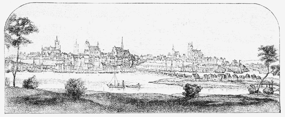 The quaint town of Thorn, on the Vistula, was more than two centuries old when Copernicus was born there on the 19th of February, 1473. The situation of this town on the frontier between Prussia and Poland, with the commodious waterway offered by the river, made it a place of considerable trade. A view of the town, as it was at the time of the birth of Copernicus, is here given. The walls, with their watch-towers, will be noted, and the strategic importance which the situation of Thorn gave to it in the fifteenth century still belongs thereto, so much so that the German Government recently constituted the town a fortress of the first class.