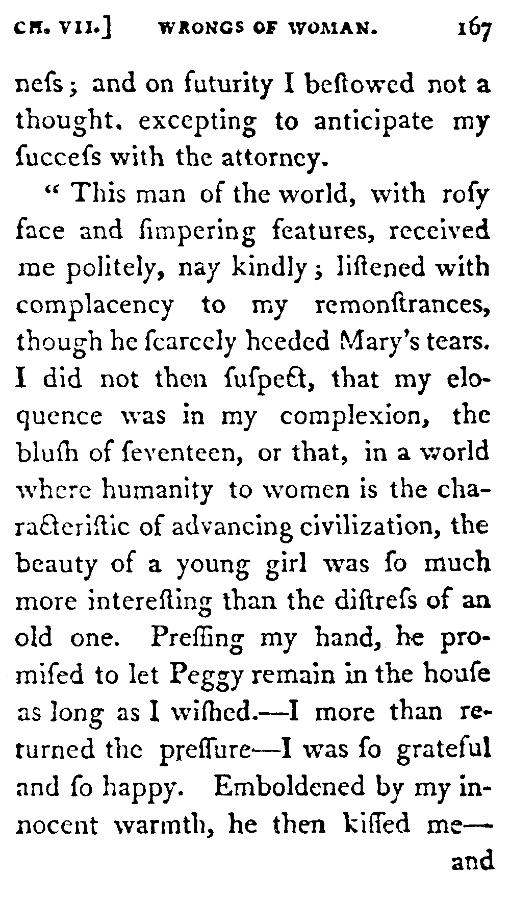 These appear to me (matrimonial despotism of heart and conduct) to be the peculiar Wrongs of Woman, be[xvii]cause they degrade the mind. What are termed great misfortunes, may more forcibly impress the mind of common readers; they have more of what may justly be termed stage-effect; but it is the delineation of finer sensations, which, in my opinion, constitutes the merit of our best novels. This is what I have in view; and to show the wrongs of different classes of women, equally oppressive, though, from the difference of education, necessarily various.