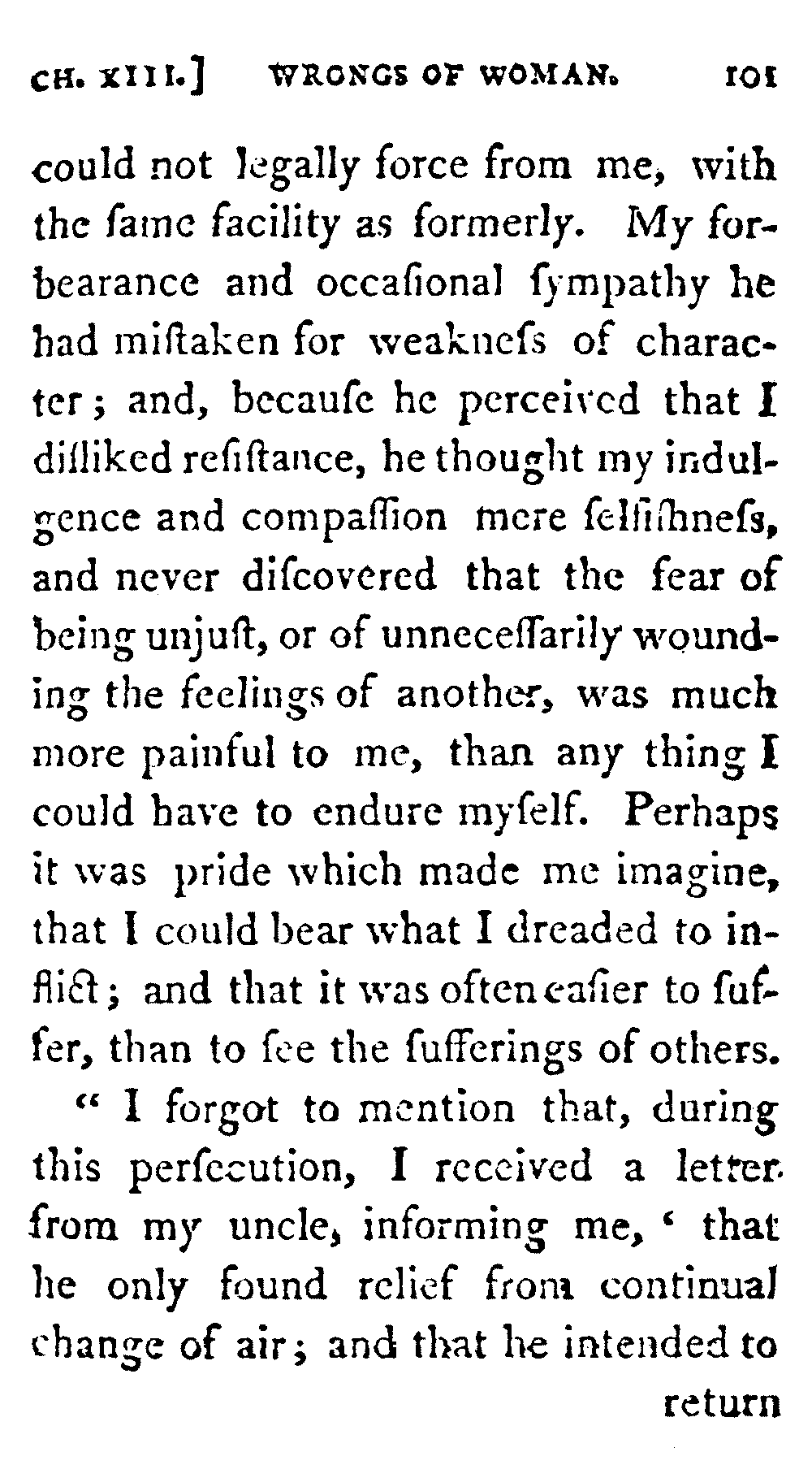 In many instances I could have made the incidents more dramatic, would I have sacrificed my main object, the desire of exhibiting the misery and oppression, peculiar to women, that arise out of the partial laws and customs of society.