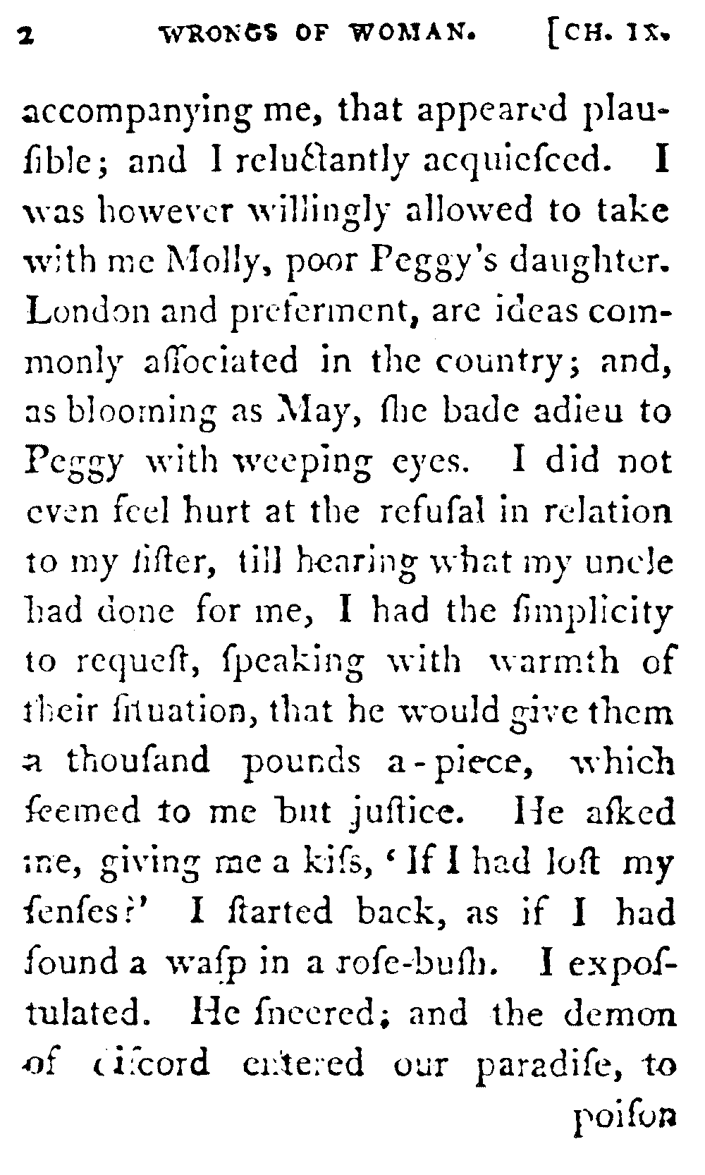 Maria alluded to the possibility of an escape, and mentioned a compensation, or reward; but the style in which she was repulsed made her cautious,[24] and determine not to renew the subject, till she knew more of the character she had to work on. Jemima's countenance, and dark hints, seemed to say, "You are an extraordinary woman; but let me consider, this may only be one of your lucid intervals." Nay, the very energy of Maria's character, made her suspect that the extraordinary animation she perceived might be the effect of madness. "Should her husband then substantiate his charge, and get possession of her estate, from whence would come the promised annuity, or more desired protection? Besides, might not a woman, anxious to escape, conceal some of the circumstances which made against her? Was truth to be expected from one who had been entrapped, kidnapped, in the most fraudulent manner?"