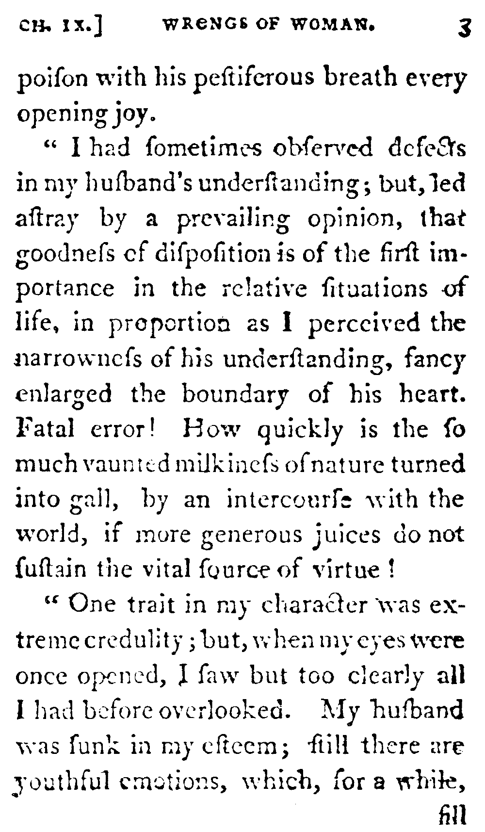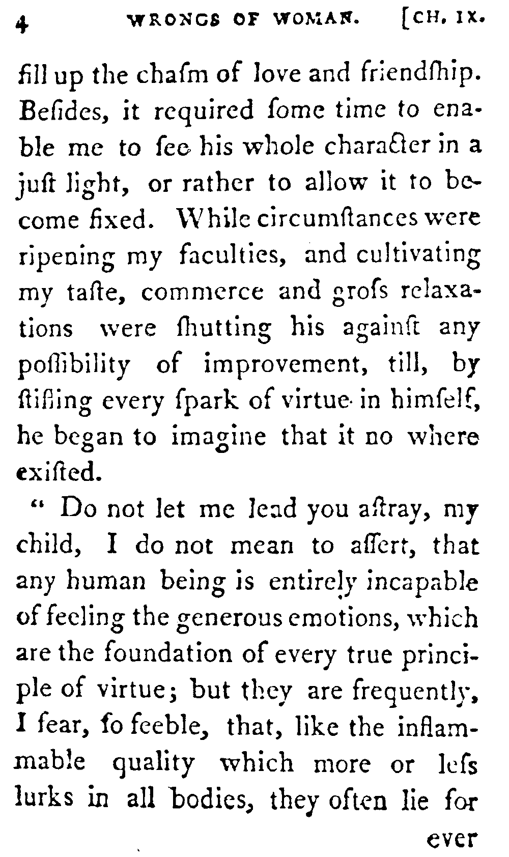 The retreating shadows of former sorrows rushed back in a gloomy train, and seemed to be pictured on the walls of her prison, magnified by the state of mind in which they were viewed—Still she mourned for her child, lamented she was a daughter, and anticipated the aggravated ills of life that her sex rendered almost inevitable, even while dreading she was no more. To think[4] that she was blotted out of existence was agony, when the imagination had been long employed to expand her faculties; yet to suppose her turned adrift on an unknown sea, was scarcely less afflicting.