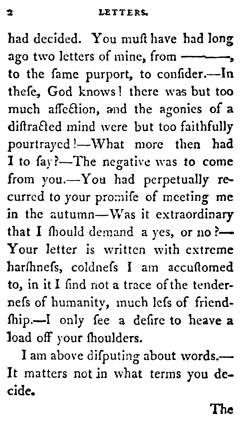 The books she had obtained, were[21] soon devoured, by one who had no other resource to escape from sorrow, and the feverish dreams of ideal wretchedness or felicity, which equally weaken the intoxicated sensibility. Writing was then the only alternative, and she wrote some rhapsodies descriptive of the state of her mind; but the events of her past life pressing on her, she resolved circumstantially to relate them, with the sentiments that experience, and more matured reason, would naturally suggest. They might perhaps instruct her daughter, and shield her from the misery, the tyranny, her mother knew not how to avoid.