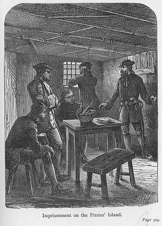 As soon as the party broke up, Jack hurried to his room, and very contrary to his usual custom threw himself into a chair, and unconsciously pressing his hand on his brow, rested his elbow on the little oak table which stood by his bedside. The way in which the walls were adorned showed the tastes of the occupant of the chamber. The most honoured ornament was a fowling-piece with a curious lock lately invented, the gift of Cousin Nat, and which had superseded the stout cross-bow hanging beneath it. One wall was devoted to fishing-rods, tackle, and nets. Among them was a rod of which Izaak Walton, that great professor of the gentle art, had himself spoken approvingly when once, while fishing in the silvery Trent, he had seen it flourished in Cousin Nat’s hands. There were two sets of foils with masks and gloves, and several cudgels with strange knots and devices, cut from ancient trees in Sherwood Forest, beneath whose once wide-spreading boughs certain feats of the renowned Robin Hood were said to have been performed. In one and all the tales relating to the exploits of the bold outlaw, it is scarcely necessary to say that Jack put the most implicit faith, and would have been highly indignant had any one ventured to doubt their authenticity or correctness. In one corner of the room stood a book-case, a very unpretending piece of furniture in itself, but it contained every ballad Jack believed to have been written, or at all events on which he could lay hold, connected with Robin Hood. It contained however other tomes: besides several schoolbooks, their dark covers sadly battered, and their leaves inked, dog’s-eared, and torn, there were kind Izaak Walton’s “Complete Angler,” highly prized by Jack; Foxe’s “Book of Martyrs,” presented to him by Aunt Bethia; and a work he valued more than all the others—Purchas’s “Travels:” and often and often as he conned these pages he longed to be able to visit the strange countries and to go through the wonderful adventures therein described.