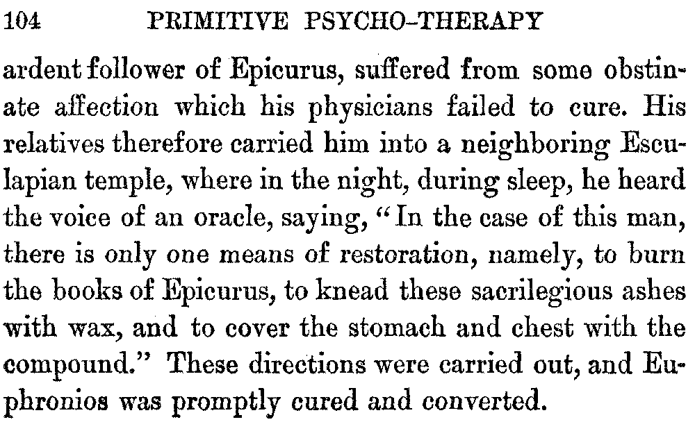 Magic writings have been and often are efficient psychic remedies for functional affections, in direct proportion to the user's faith in them. A certain sense of mystery seems essential. Given that, and plenty of confidence, and it matters not whether the inscriptions are biblical verses, unintelligible jargon, or even invocations of the Devil.