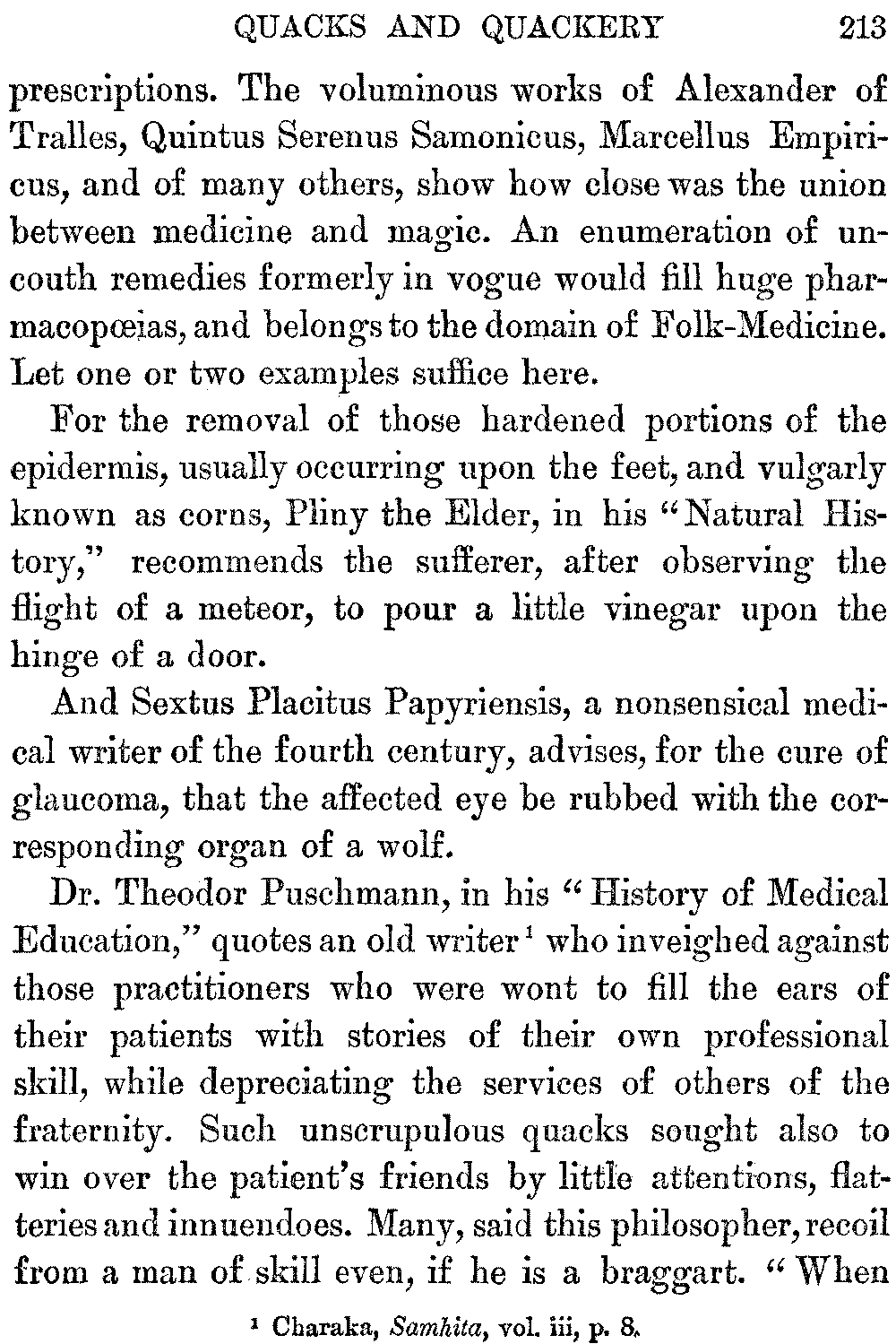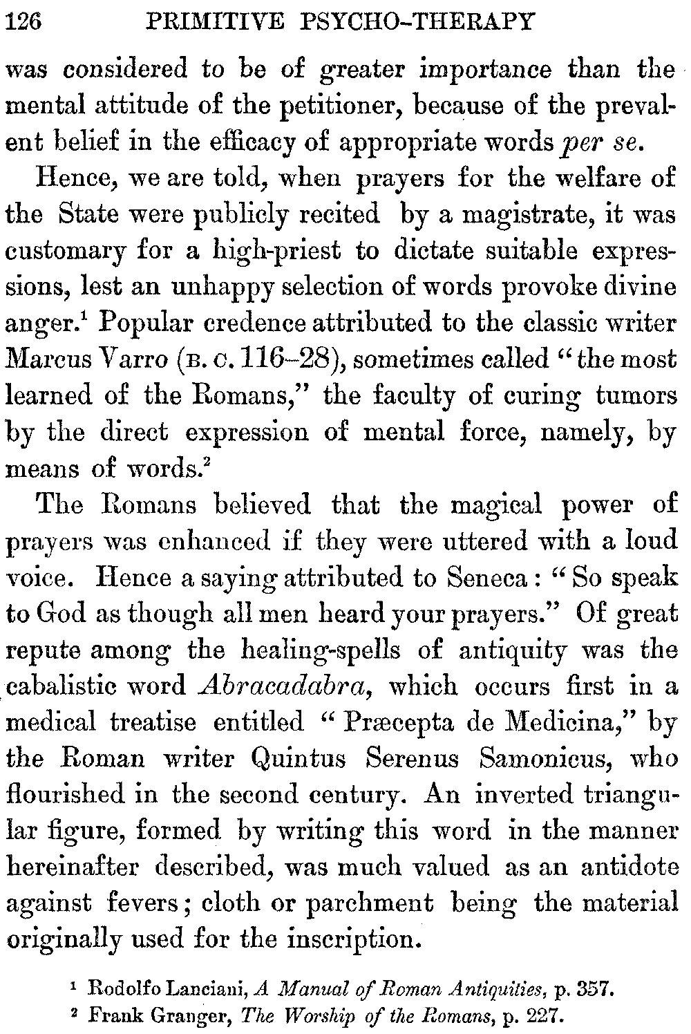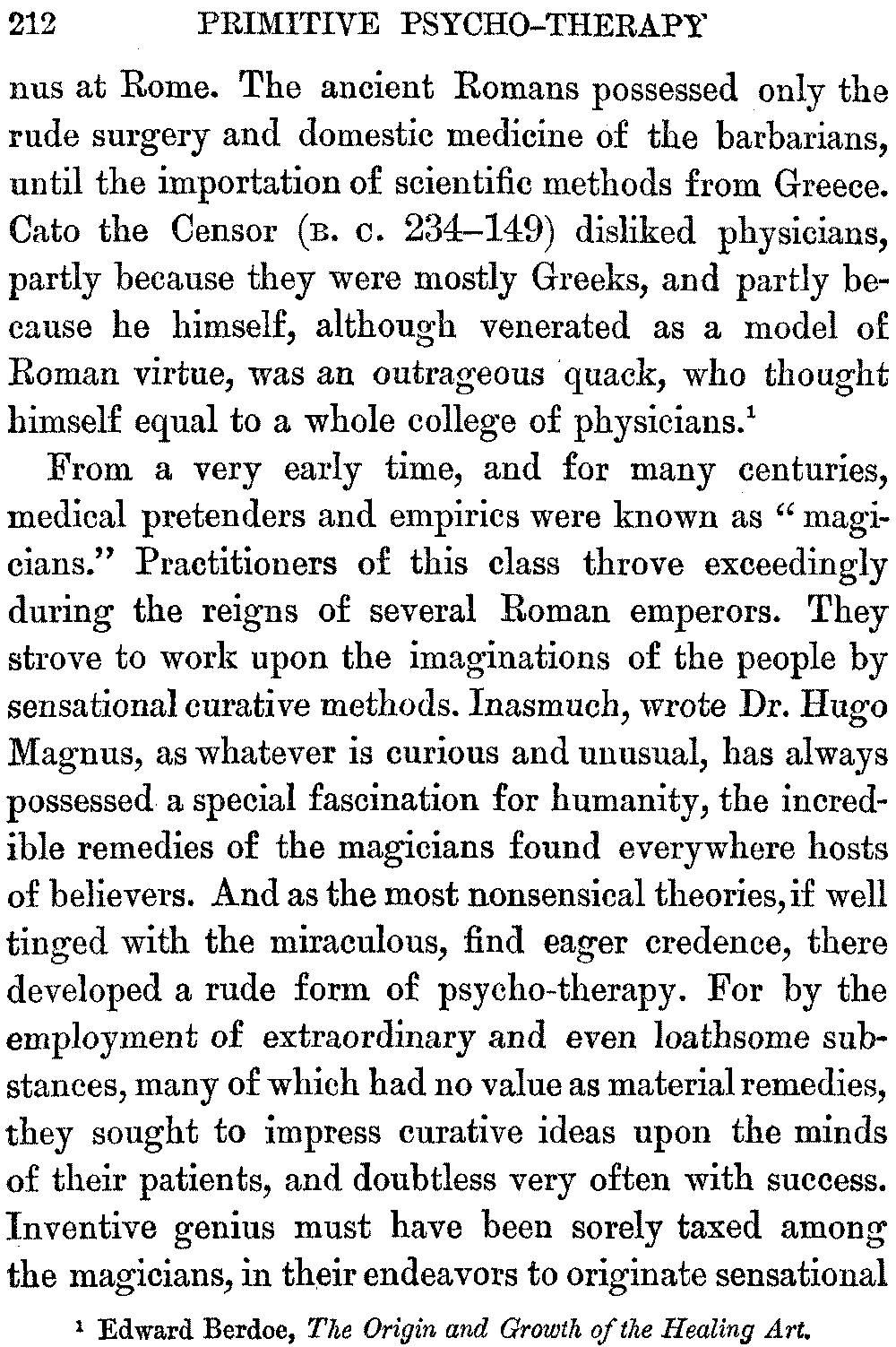The Roman writer, Quintus Serenus Samonicus, author of "Carmen de Medicina," is said to have recommended as a cure for quartan ague, the placing of the fourth book of the Iliad under the patient's head.[10:1] Charm-magic has been regarded as a survival of animism, the theory which endows the phenomena of nature with personal life. It has also been defined as the explanation of all natural phenomena, not due to obvious material causes, by attributing them to spiritual agencies.