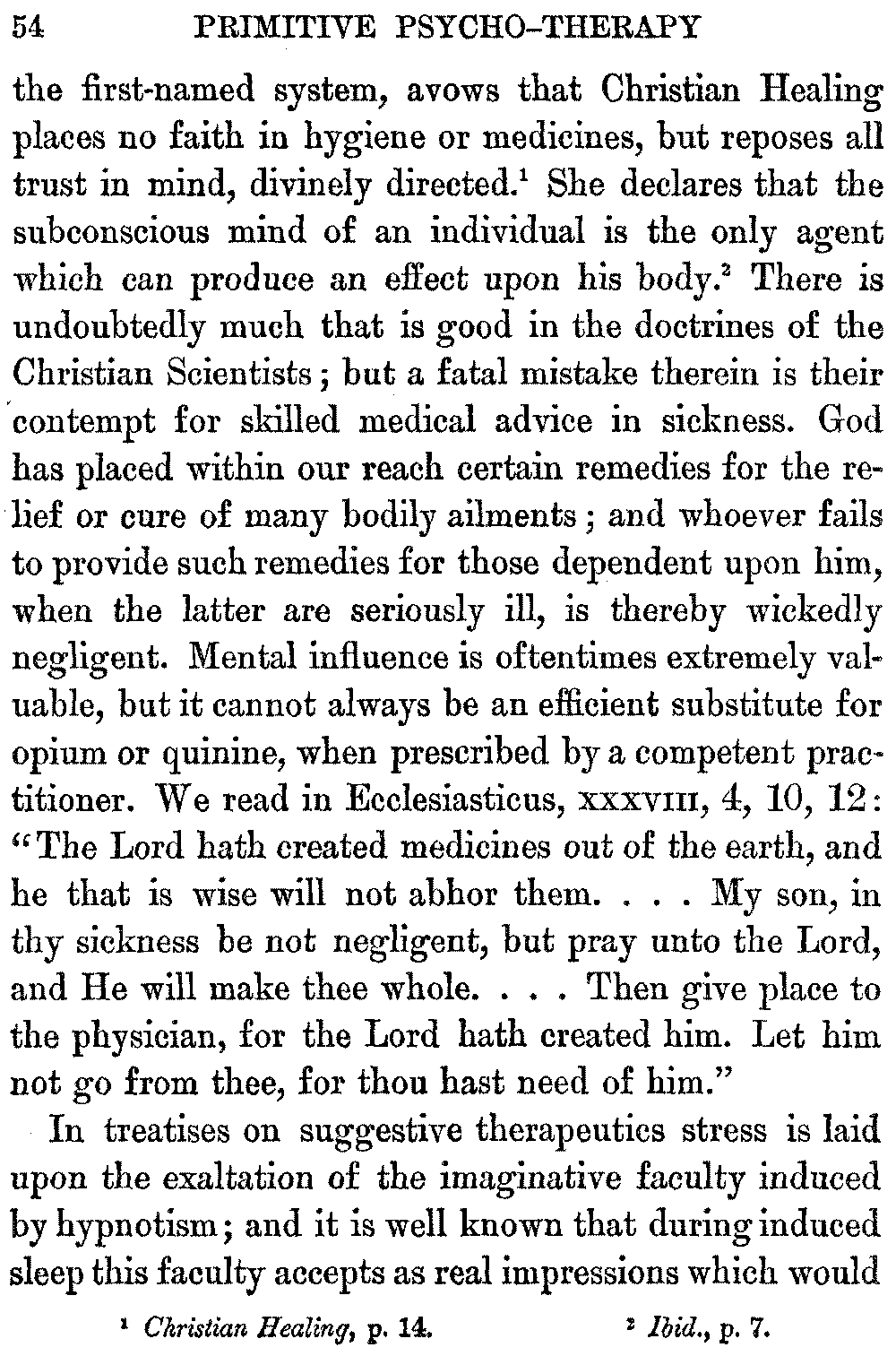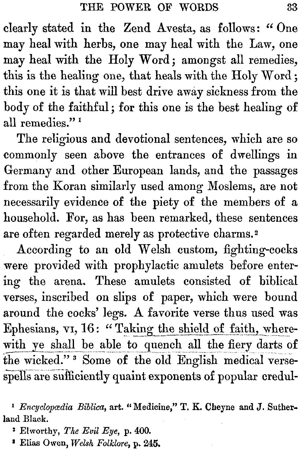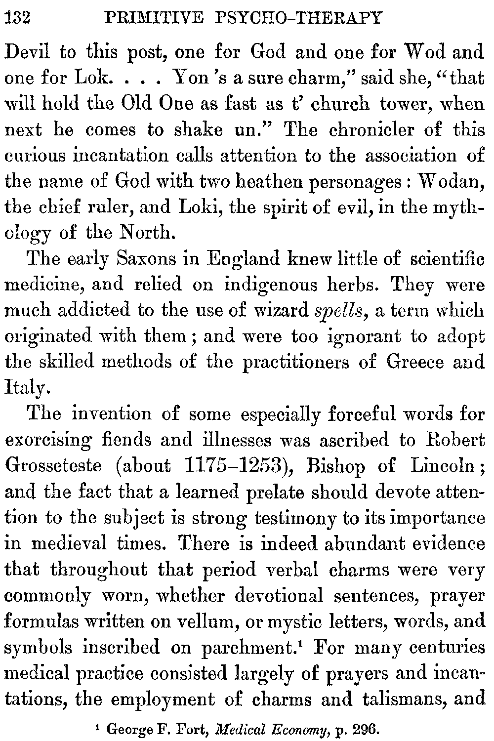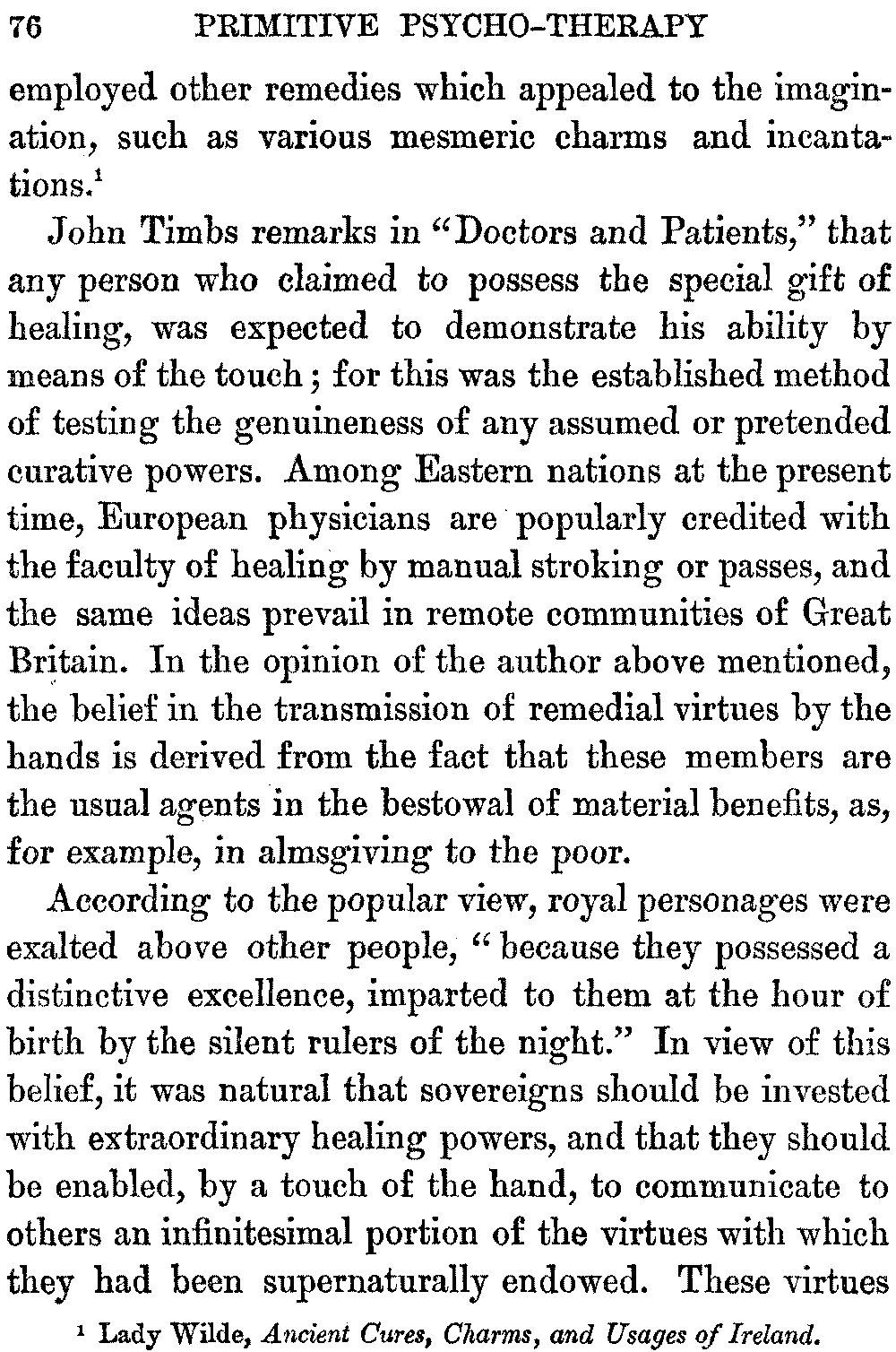 From very early times, says Lady Wilde, the pagan physicians of Ireland, who were famous as skilled practitioners, were prominent among the Druids. Although thoroughly conversant with the healing properties of herbs, they appreciated keenly the influence exerted upon the minds of their patients by charms, fairy cures, and incantations. Therefore their methods of treatment were of a medico-religious character, the psychic element being utilized in the form of various magic rites and ceremonies, which were important healing factors. [13]The ancient Druidic charms are still in use among the Irish peasants, the titles of pagan deities being replaced, however, by the name of Christ and words of the Christian ritual. In this form they are regarded as magic talismans, when repeated over the sick, and the peasants have a strong faith in these mystic formulas, which have a powerful hold upon their imaginations, having been transmitted to them through many generations of a credulous ancestry.[13:1]