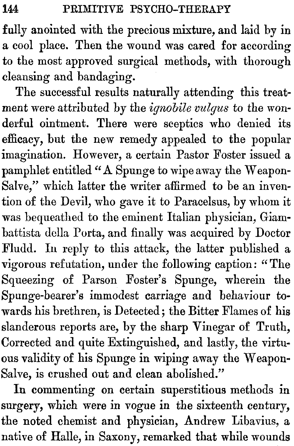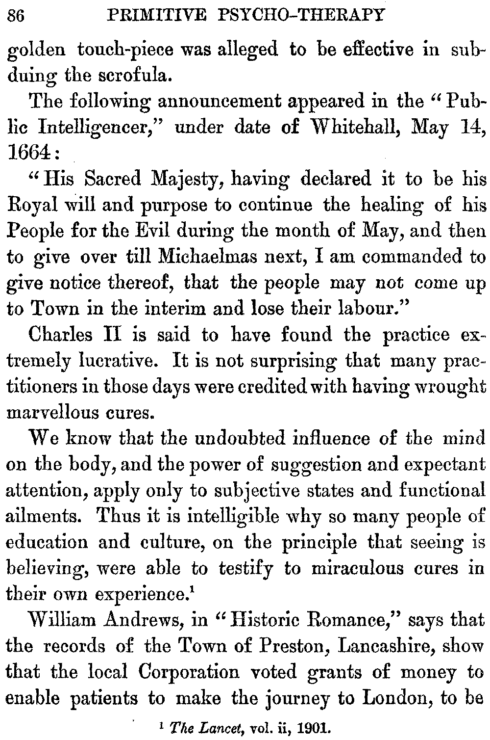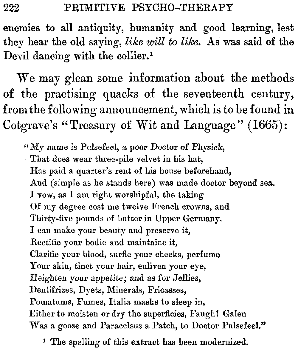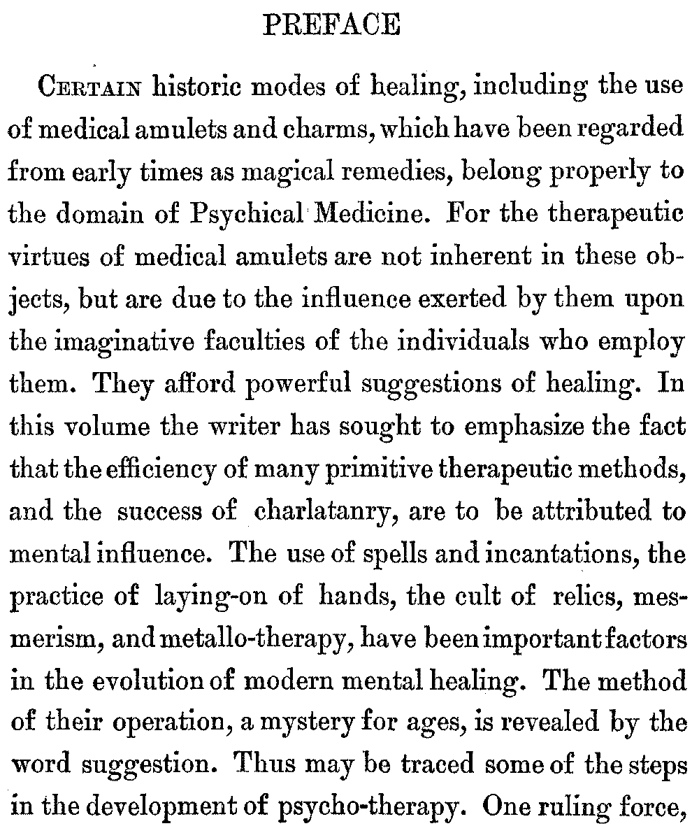 Certain historic modes of healing, including the use of medical amulets and charms, which have been regarded from early times as magical remedies, belong properly to the domain of Psychical Medicine. For the therapeutic virtues of medical amulets are not inherent in these objects, but are due to the influence exerted by them upon the imaginative faculties of the individuals who employ them. They afford powerful suggestions of healing. In this volume the writer has sought to emphasize the fact that the efficiency of many primitive therapeutic methods, and the success of charlatanry, are to be attributed to mental influence. The use of spells and incantations, the practice of laying-on of hands, the cult of relics, mesmerism, and metallo-therapy, have been important factors in the evolution of modern mental healing. The method of their operation, a mystery for ages, is revealed by the word suggestion. Thus may be traced some of the steps in the development of psycho-therapy. One ruling force, [viii]namely, the power of the imagination, has always been the potent therapeutic agent, whether in the word of command, in medical scripts, or in the methods of quackery.