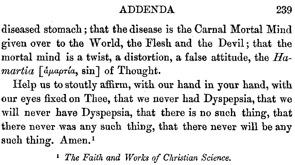 Apropos of this subject, Charles M. Barrows, in "Facts and Fictions of Mental Healing," remarks that whatever acts upon a patient in such a way as to persuade him to yield himself to the therapeutic force constantly operative in Nature, is a means of healing. It may be an amulet, a cabalistic symbol, an incantation, a bread-pill, or even sudden fright. It may be a drug prescribed by a physician, imposition of hands, mesmeric passes, the touch of a relic, or visiting a sacred shrine.
