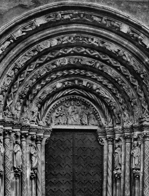 [10]The golden portal of the Cathedral at Freiberg in Saxony / Ruins of the former Church of our Lady. About 1230 / The absolute climax in the development of the Romanesque Portal, which produced so much of rare beauty (Dehio) / The style of this creation is of the most perfect delicacy and charm (Lübke) / Partial view from a photograph by the National Messbildanstalt, Berlin