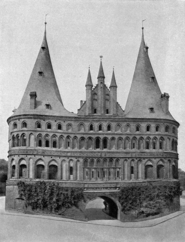 [34]Masterpiece of Gothic architecture in brick in Northern Germany / The Holstentor (Holsten Gate) in Lübeck, built by Hinrich Helmsted, 1470–1477, an imposing monument of the architecture of civic fortifications / From a photograph by the National Messbildanstalt, Berlin