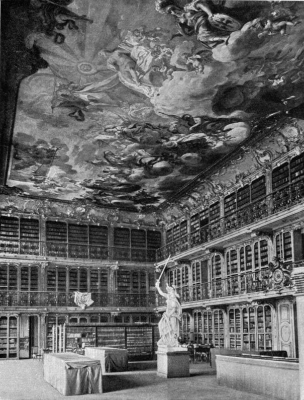 [44]The library in the former residence of the Electors at Mannheim, built in 1720–1759 by Nikolaus de Pigage / Splendid specimen of a masterpiece of the Baroque period / From a photograph by Josef Kuld, Mannheim