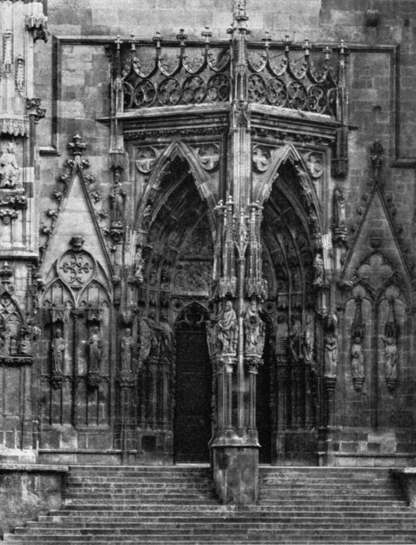 [64]The Cathedral at Regensburg, begun in 1275, completed in 1869 / The rich facade with the three cornered vestibule executed by Lybhart the Mynner, 1385–1395 / From a photograph by M. Stich, Nuremberg