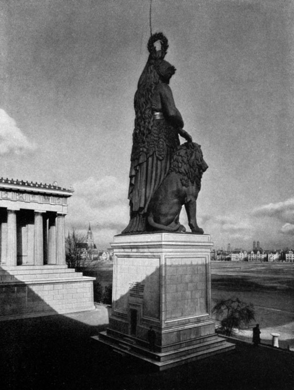 [80]The Bavaria in front of the Hall of Fame in Munich / Erected by King Ludwig I, 1843–1853 / The Hall of Fame built by Leo von Klenze, the colossal statue of the Bavaria modeled by Schwanthaler, cast by Ferdinand Miller / From a photograph by Jaeger and Görgen, Munich