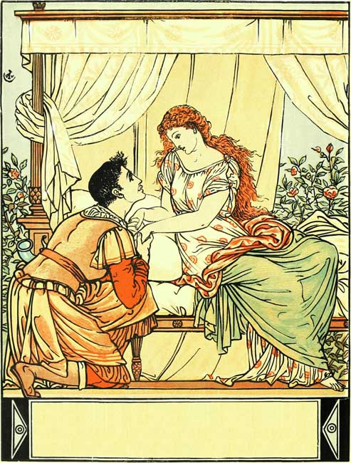 He stands—he stoops to gaze—he kneels—he wakes her with a kiss.