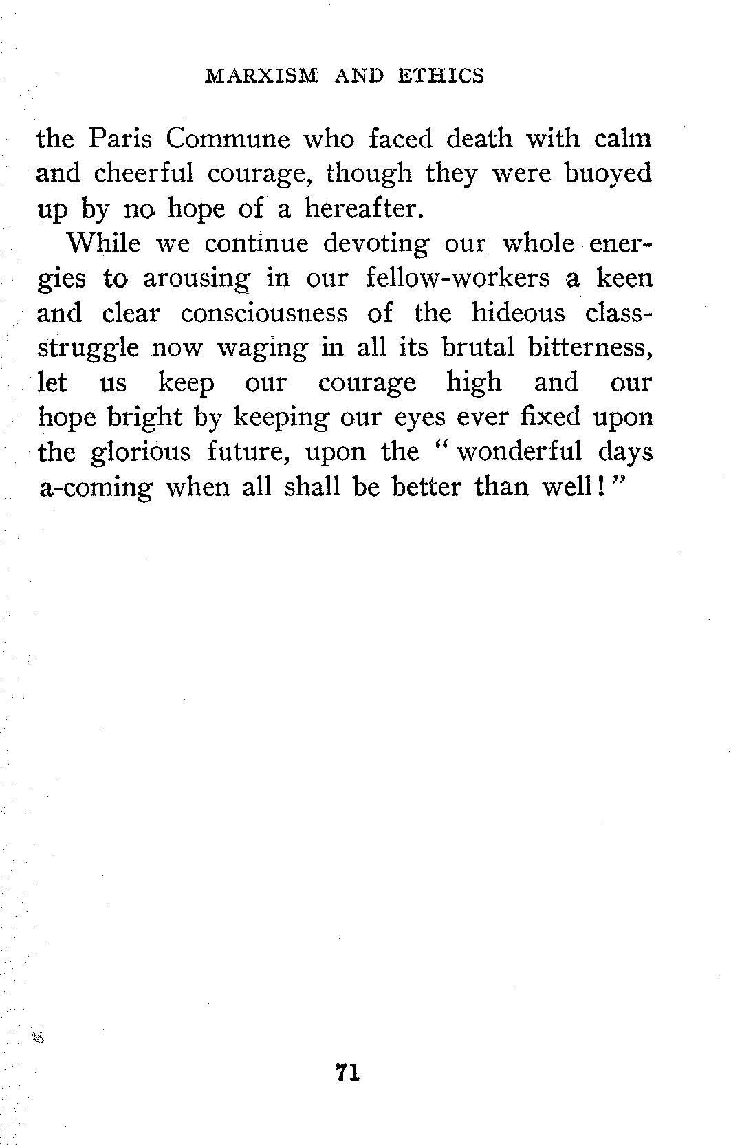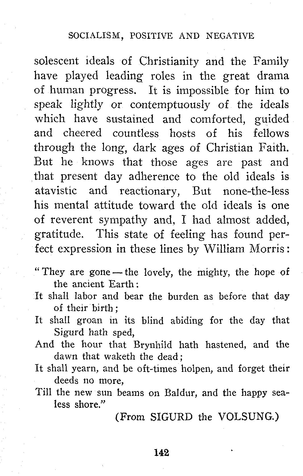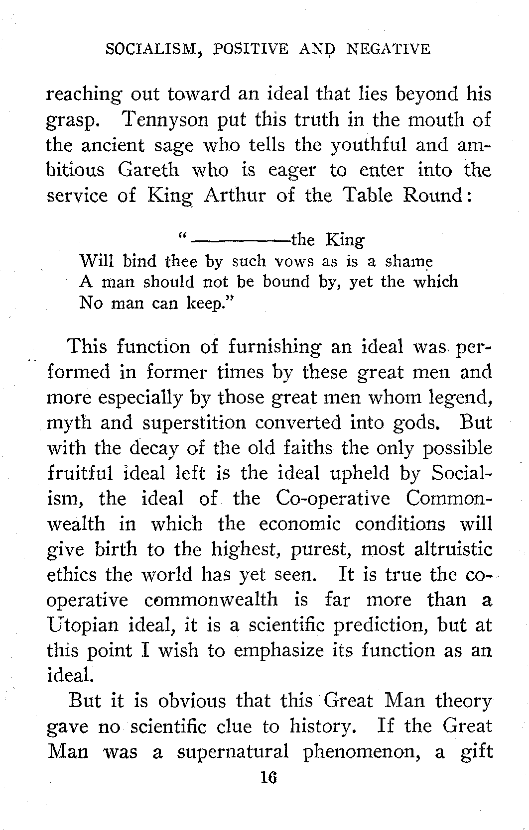 This function of furnishing an ideal was performed in former times by these great men and more especially by those great men whom legend, myth and superstition converted into gods. But with the decay of the old faiths the only possible fruitful ideal left is the ideal upheld by Socialism, the ideal of the Co-operative Commonwealth in which the economic conditions will give birth to the highest, purest, most altruistic ethics the world has yet seen. It is true the co-operative commonwealth is far more than a Utopian ideal, it is a scientific prediction, but at this point I wish to emphasize its function as an ideal.