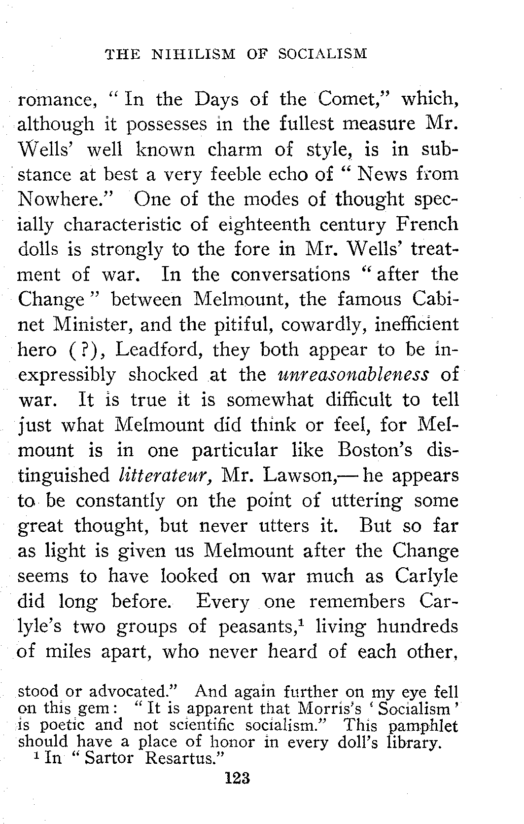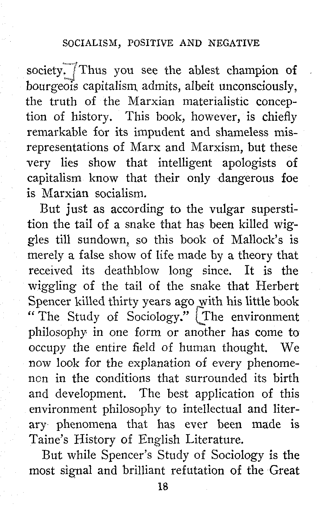 But just as according to the vulgar superstition the tail of a snake that has been killed wiggles till sundown, so this book of Mallock's is merely a false show of life made by a theory that received its deathblow long since. It is the wiggling of the tail of the snake that Herbert Spencer killed thirty years ago with his little book "The Study of Sociology." The environment philosophy in one form or another has come to occupy the entire field of human thought. We now look for the explanation of every phenomenon in the conditions that surrounded its birth and development. The best application of this environment philosophy to intellectual and literary phenomena that has ever been made is Taine's History of English Literature.