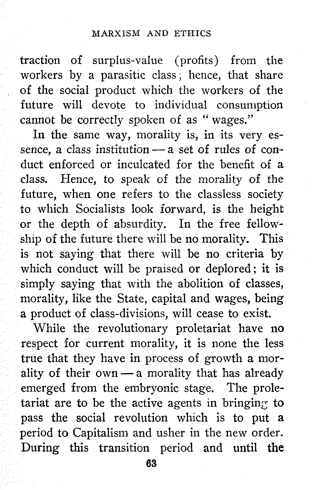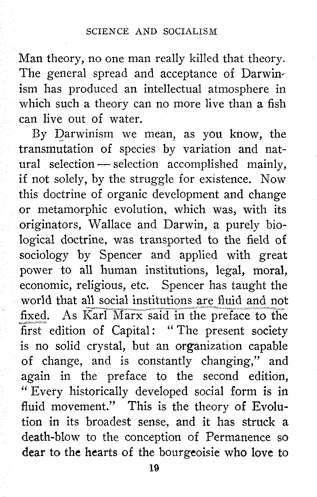 By Darwinism we mean, as you know, the transmutation of species by variation and natural selection—selection accomplished mainly, if not solely, by the struggle for existence. Now this doctrine of organic development and change or metamorphic evolution, which was, with its originators, Wallace and Darwin, a purely biological doctrine, was transported to the field of sociology by Spencer and applied with great power to all human institutions, legal, moral, economic, religious, etc. Spencer has taught the world that all social institutions are fluid and not fixed. As Karl Marx said in the preface to the first edition of Capital: "The present society is no solid crystal, but an organization capable of change, and is constantly changing," and again in the preface to the second edition, "Every historically developed social form is in fluid movement." This is the theory of Evolution in its broadest sense, and it has struck a death-blow to the conception of Permanence so dear to the hearts of the bourgeoisie who love to[20] sing to their Great God, Private Property, "As it was in the beginning, is now and ever shall be, world without end. Amen." "Saecula saeculorum." "For the Ages of Ages."
