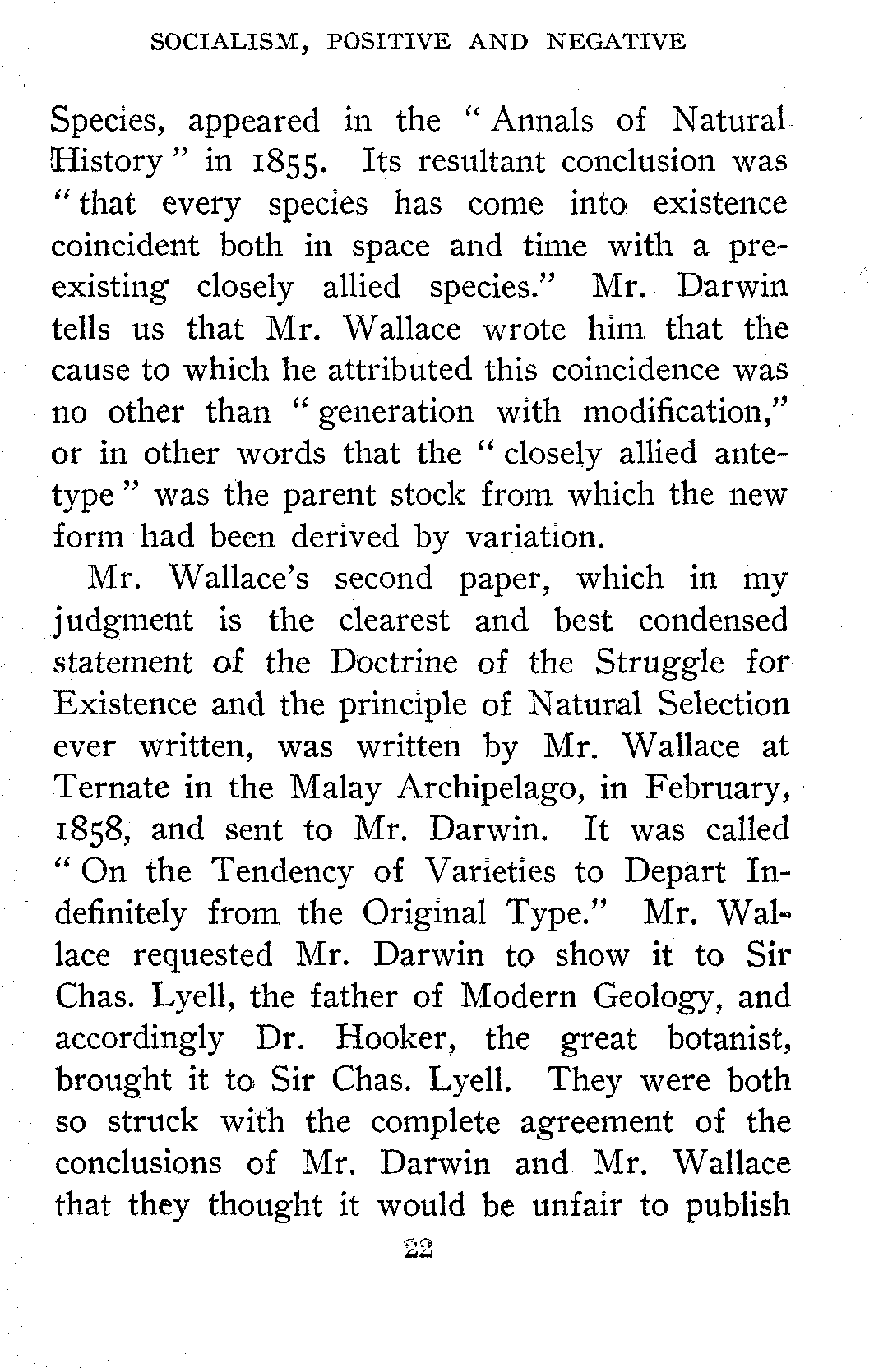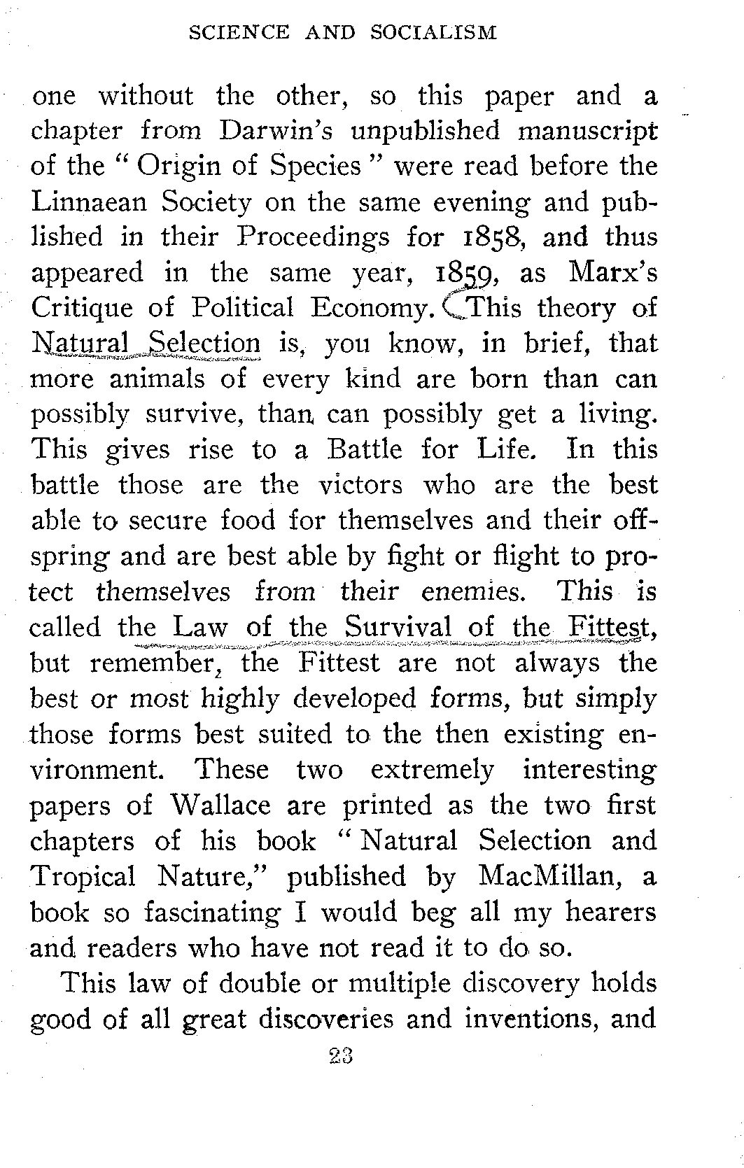 Mr. Wallace's second paper, which in my judgment is the clearest and best condensed statement of the Doctrine of the Struggle for Existence and the principle of Natural Selection ever written, was written by Mr. Wallace at Ternate in the Malay Archipelago, in February, 1858, and sent to Mr. Darwin. It was called "On the Tendency of Varieties to Depart Indefinitely from the Original Type." Mr. Wallace requested Mr. Darwin to show it to Sir Chas. Lyell, the father of Modern Geology, and accordingly Dr. Hooker, the great botanist, brought it to Sir Chas. Lyell. They were both so struck with the complete agreement of the conclusions of Mr. Darwin and Mr. Wallace that they thought it would be unfair to publish[23] one without the other, so this paper and a chapter from Darwin's unpublished manuscript of the "Origin of Species" were read before the Linnaean Society on the same evening and published in their Proceedings for 1858, and thus appeared in the same year, 1859, as Marx's Critique of Political Economy. This theory of Natural Selection is, you know, in brief, that more animals of every kind are born than can possibly survive, than can possibly get a living. This gives rise to a Battle for Life. In this battle those are the victors who are the best able to secure food for themselves and their offspring and are best able by fight or flight to protect themselves from their enemies. This is called the Law of the Survival of the Fittest, but remember, the Fittest are not always the best or most highly developed forms, but simply those forms best suited to the then existing environment. These two extremely interesting papers of Wallace are printed as the two first chapters of his book "Natural Selection and Tropical Nature," published by MacMillan, a book so fascinating I would beg all my hearers and readers who have not read it to do so.