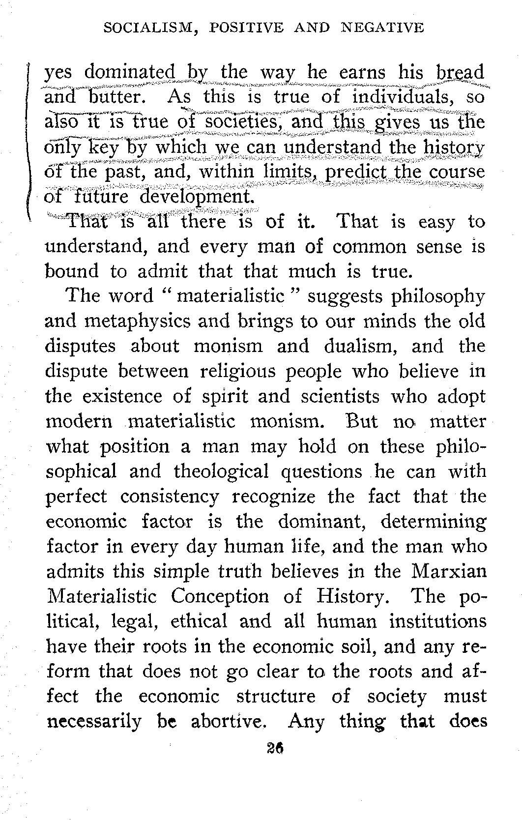 At bottom, when we talk intelligently of the Materialistic Conception of History, we simply mean, what every man by his daily conduct proves to be true, that the bread and butter question is the most important question in life. All the rest of the life of the individual is affected,[26] yes dominated the way he earns his bread and butter. As this is true of individuals, so also it is true of societies, and this gives us the only key by which we can understand the history of the past, and, within limits, predict the course of future development.