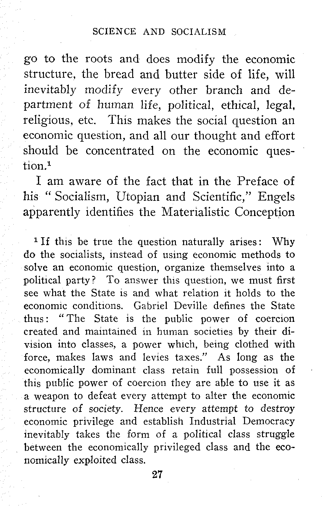 [2] If this be true the question naturally arises: Why do the socialists, instead of using economic methods to solve an economic question, organize themselves into a political party? To answer this question, we must first see what the State is and what relation it holds to the economic conditions. Gabriel Deville defines the State thus: "The State is the public power of coercion created and maintained in human societies by their division into classes, a power which, being clothed with force, makes laws and levies taxes." As long as the economically dominant class retain full possession of this public power of coercion they are able to use it as a weapon to defeat every attempt to alter the economic structure of society. Hence every attempt to destroy economic privilege and establish Industrial Democracy inevitably takes the form of a political class struggle between the economically privileged class and the economically exploited class.