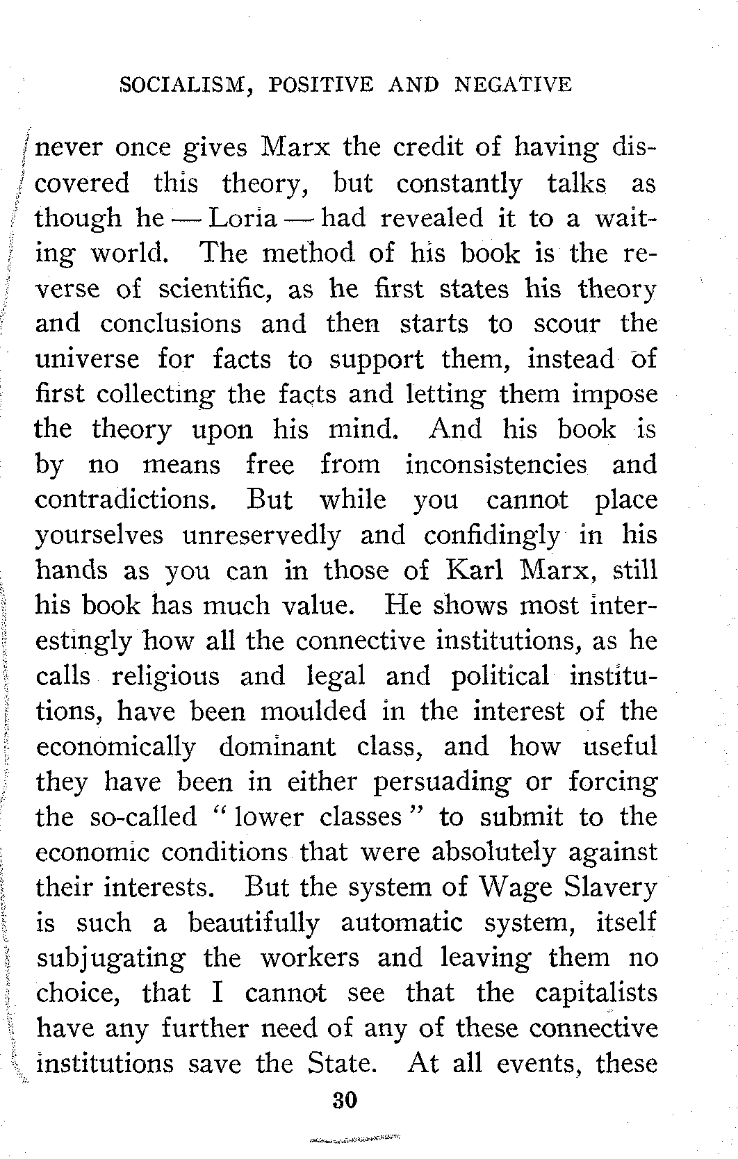The doctrine is stated in nearly the same language by Loria and Ferri, though Ferri calls it Economic Determinism, which seems to me a much better and more exact name. Ferri points out that we must not forget the intellectual factor and the various other factors, which though they are themselves determined by the economic factor, in their turn become causes acting concurrently with the economic factor. Loria deals with this whole subject most exhaustively and interestingly in his recently translated book "The Economic Foundations of Society." Curiously enough in this long book he[30] never once gives Marx the credit of having discovered this theory, but constantly talks as though he—Loria—had revealed it to a waiting world. The method of his book is the reverse of scientific, as he first states his theory and conclusions and then starts to scour the universe for facts to support them, instead of first collecting the facts and letting them impose the theory upon his mind. And his book is by no means free from inconsistencies and contradictions. But while you cannot place yourselves unreservedly and confidingly in his hands as you can in those of Karl Marx, still his book has much value. He shows most interestingly how all the connective institutions, as he calls religious and legal and political institutions, have been moulded in the interest of the economically dominant class, and how useful they have been in either persuading or forcing the so-called "lower classes" to submit to the economic conditions that were absolutely against their interests. But the system of Wage Slavery is such a beautifully automatic system, itself subjugating the workers and leaving them no choice, that I cannot see that the capitalists have any further need of any of these connective institutions save the State. At all events, these[31] institutions are fast losing their power over the minds of men. But the most valuable part of his book is the immense mass of evidence he has collected showing how political sovereignty follows economic sovereignty or rather, revenue, and how all past history has been made up of a series of contests between various kinds of revenue, particularly between rent from landed property and profits from industrial or manufacturing capital, but as this is nothing more than the Class Struggle between the landed aristocracy and the bourgeoisie, a struggle sketched by master hands in the Communist Manifesto of Marx and Engels, we can give Loria no credit for originality, but merely praise his industry in collecting evidence.