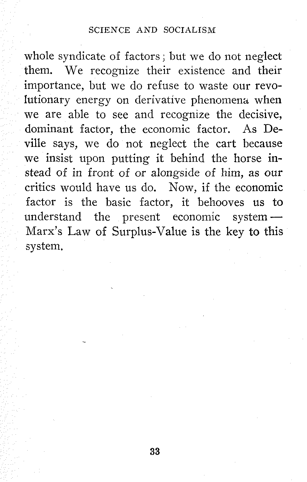 We Marxians are often accused of neglecting the intellectual factor and, as Deville says, a[33] whole syndicate of factors; but we do not neglect them. We recognize their existence and their importance, but we do refuse to waste our revolutionary energy on derivative phenomena when we are able to see and recognize the decisive, dominant factor, the economic factor. As Deville says, we do not neglect the cart because we insist upon putting it behind the horse instead of in front of or alongside of him, as our critics would have us do. Now, if the economic factor is the basic factor, it behooves us to understand the present economic system—Marx's Law of Surplus-Value is the key to this system.