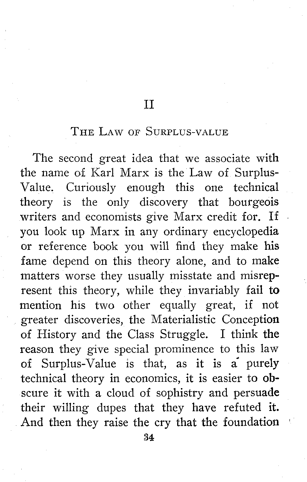 The second great idea that we associate with the name of Karl Marx is the Law of Surplus-Value. Curiously enough this one technical theory is the only discovery that bourgeois writers and economists give Marx credit for. If you look up Marx in any ordinary encyclopedia or reference book you will find they make his fame depend on this theory alone, and to make matters worse they usually misstate and misrepresent this theory, while they invariably fail to mention his two other equally great, if not greater discoveries, the Materialistic Conception of History and the Class Struggle. I think the reason they give special prominence to this law of Surplus-Value is that, as it is a purely technical theory in economics, it is easier to obscure it with a cloud of sophistry and persuade their willing dupes that they have refuted it. And then they raise the cry that the foundation[35] of Marxian Socialism has been destroyed and that the whole structure is about to tumble down on the heads of its crazy defenders, the Socialists. It is much to be regretted that many so-called Socialists are found foolish enough to play into the hands of the Capitalists by joining in the silly cry that some pigmy in political economy has overthrown the Marxian theory of Value. I suppose these so-called Socialists are actuated by a mad desire to be up to date, to keep up with the intellectual band-wagon. Revolutions in the various sciences have been going on so rapidly, they fancy that a theory that was formulated forty years ago must be a back-number, and so they hasten to declare their allegiance to the last new cloud of sophistry, purporting to be a theory of value, that has been evolved by the feeble minds of the anarchists of Italy or the capitalist economists of Austria. The Fabians of London are the most striking example of these socialists whose heads have been turned in this way by the rapid progress of science. But the followers of Bernstein in Europe and this country are running into the same danger and in their eagerness to grasp the very newest and latest doctrine will fall easy victims of the first windy and pretentious fakir[36] who comes along. Ask any one of these fellows who tells you that the Marxian theory of Value has been exploded, to state the new and correct theory of Value that has taken its place and you will find that he cannot state a theory that you or I or any other man can understand. He will either admit he is floored, or else he will emit a dense fog of words. I challenge any one of them to state a theory of value that he himself can understand, let alone make any one else understand.
