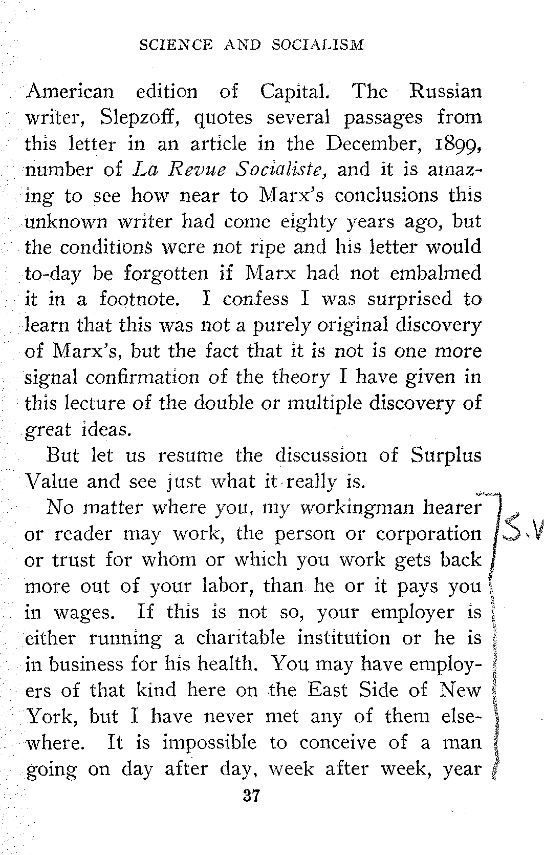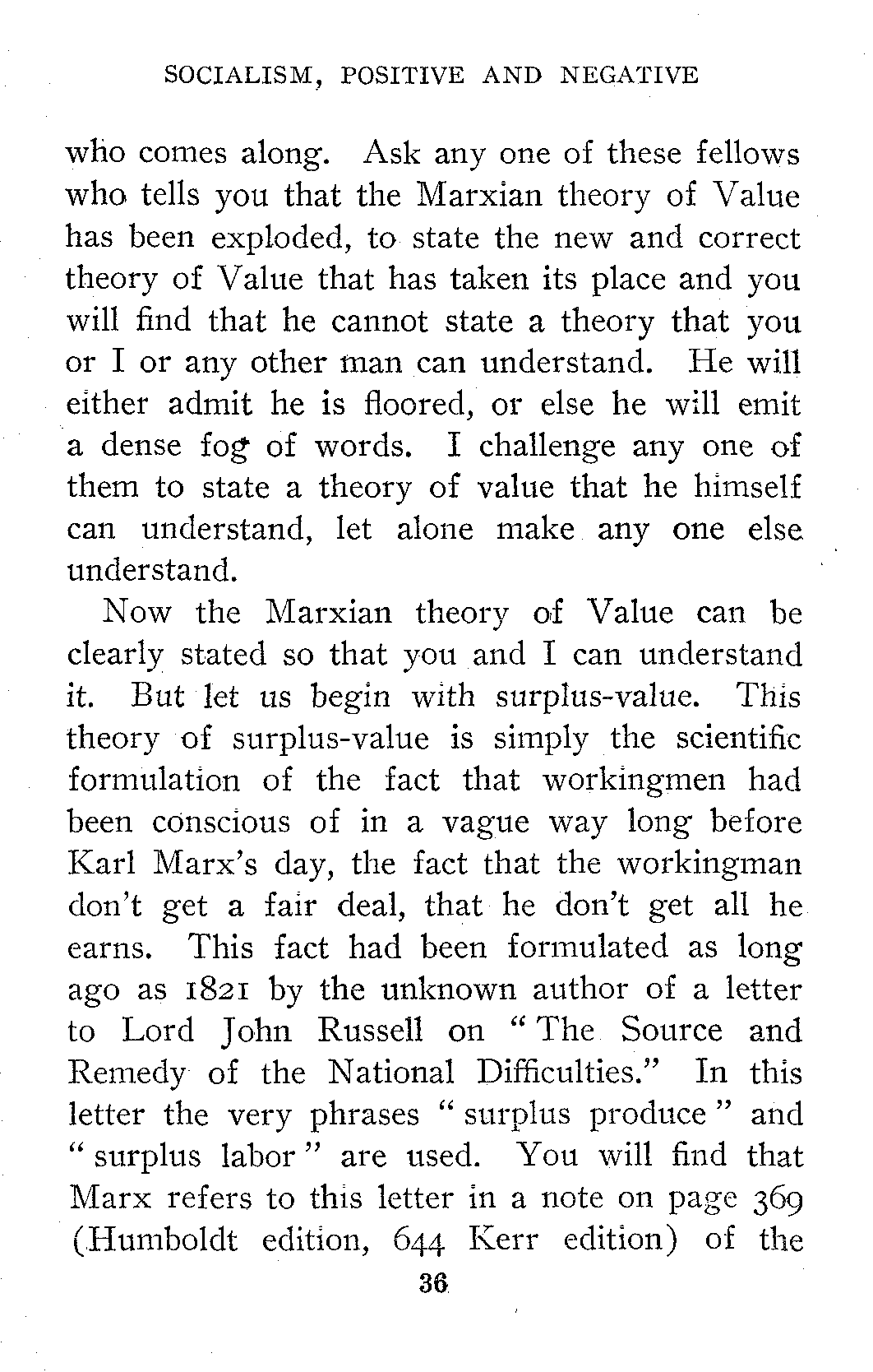 Now the Marxian theory of Value can be clearly stated so that you and I can understand it. But let us begin with surplus-value. This theory of surplus-value is simply the scientific formulation of the fact that workingmen had been conscious of in a vague way long before Karl Marx's day, the fact that the workingman don't get a fair deal, that he don't get all he earns. This fact had been formulated as long ago as 1821 by the unknown author of a letter to Lord John Russell on "The Source and Remedy of the National Difficulties." In this letter the very phrases "surplus produce" and "surplus labor" are used. You will find that Marx refers to this letter in a note on page 369 (Humboldt edition, 644 Kerr edition) of the[37] American edition of Capital. The Russian writer, Slepzoff, quotes several passages from this letter in an article in the December, 1899, number of La Revue Socialiste, and it is amazing to see how near to Marx's conclusions this unknown writer had come eighty years ago, but the conditions were not ripe and his letter would to-day be forgotten if Marx had not embalmed it in a footnote. I confess I was surprised to learn that this was not a purely original discovery of Marx's, but the fact that it is not is one more signal confirmation of the theory I have given in this lecture of the double or multiple discovery of great ideas.