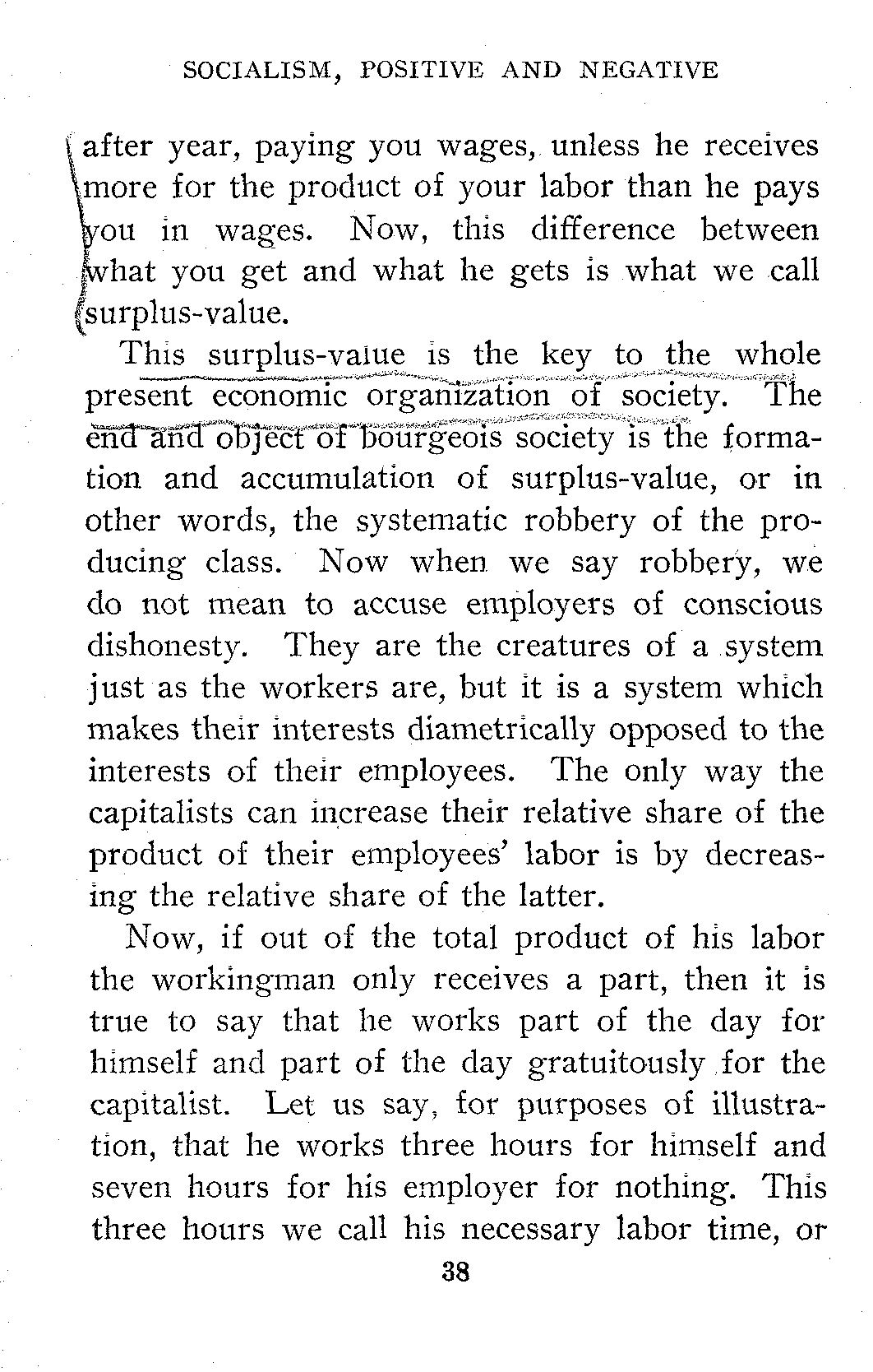No matter where you, my workingman hearer or reader may work, the person or corporation or trust for whom or which you work gets back more out of your labor, than he or it pays you in wages. If this is not so, your employer is either running a charitable institution or he is in business for his health. You may have employers of that kind here on the East Side of New York, but I have never met any of them elsewhere. It is impossible to conceive of a man going on day after day, week after week, year[38] after year, paying you wages, unless he receives more for the product of your labor than he pays you in wages. Now, this difference between what you get and what he gets is what we call surplus-value.