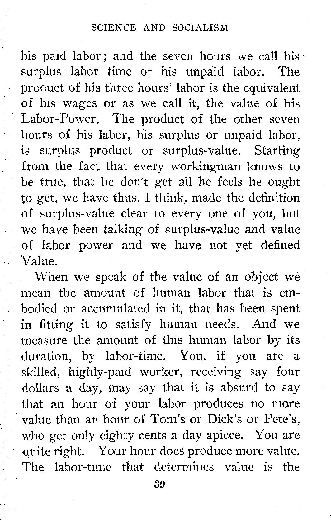 When we speak of the value of an object we mean the amount of human labor that is embodied or accumulated in it, that has been spent in fitting it to satisfy human needs. And we measure the amount of this human labor by its duration, by labor-time. You, if you are a skilled, highly-paid worker, receiving say four dollars a day, may say that it is absurd to say that an hour of your labor produces no more value than an hour of Tom's or Dick's or Pete's, who get only eighty cents a day apiece. You are quite right. Your hour does produce more value. The labor-time that determines value is the[40] labor-time of the average, untrained worker. Again, you may waste your time, spending half of it looking out of the window or carrying on a flirtation. This wasted labor does not count in measuring value. The only labor that counts is the labor that is socially necessary under normal conditions for the production of the given commodity. Again, labor spent to produce a useless article does not produce value. To produce value the labor must serve to satisfy human wants. Now, I think this is quite clear so far. We know what surplus-value is. We know what value is and how it is measured. Let us now see what is meant by the Value of Labor-Power.