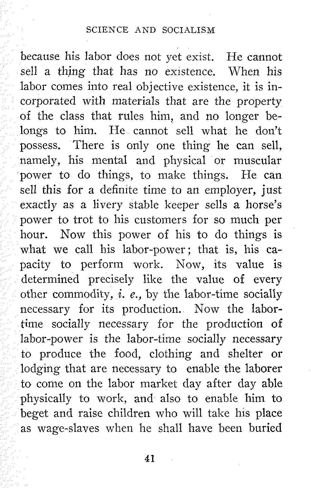 To begin with, what is Labor-Power? When a workingman goes upon the market to sell something for money with which to buy bread and butter and other necessaries of life, what has he to offer for sale? He cannot offer a finished commodity, such as a watch, a shoe, or a book, because he owns nothing. He has neither the necessary machinery, the necessary raw material, nor even the necessary place in which to work to make these things. These all belong to another class who by owning them, in fact, own him. He cannot offer labor for sale,[41] because his labor does not yet exist. He cannot sell a thing that has no existence. When his labor comes into real objective existence, it is incorporated with materials that are the property of the class that rules him, and no longer belongs to him. He cannot sell what he don't possess. There is only one thing he can sell, namely, his mental and physical or muscular power to do things, to make things. He can sell this for a definite time to an employer, just exactly as a livery stable keeper sells a horse's power to trot to his customers for so much per hour. Now this power of his to do things is what we call his labor-power; that is, his capacity to perform work. Now, its value is determined precisely like the value of every other commodity, i. e., by the labor-time socially necessary for its production. Now the labor-time socially necessary for the production of labor-power is the labor-time socially necessary to produce the food, clothing and shelter or lodging that are necessary to enable the laborer to come on the labor market day after day able physically to work, and also to enable him to beget and raise children who will take his place as wage-slaves when he shall have been buried[42] by the County or some Sick and Death Benefit Fund.