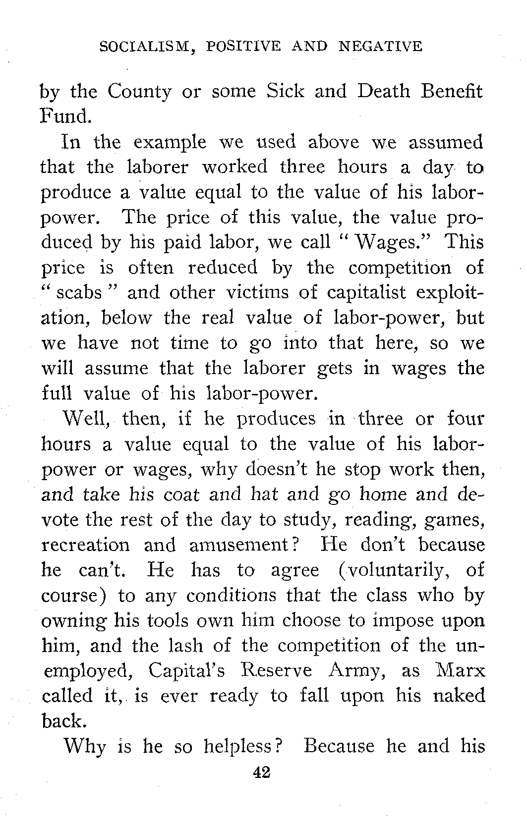 In the example we used above we assumed that the laborer worked three hours a day to produce a value equal to the value of his labor-power. The price of this value, the value produced by his paid labor, we call "Wages." This price is often reduced by the competition of "scabs" and other victims of capitalist exploitation, below the real value of labor-power, but we have not time to go into that here, so we will assume that the laborer gets in wages the full value of his labor-power.