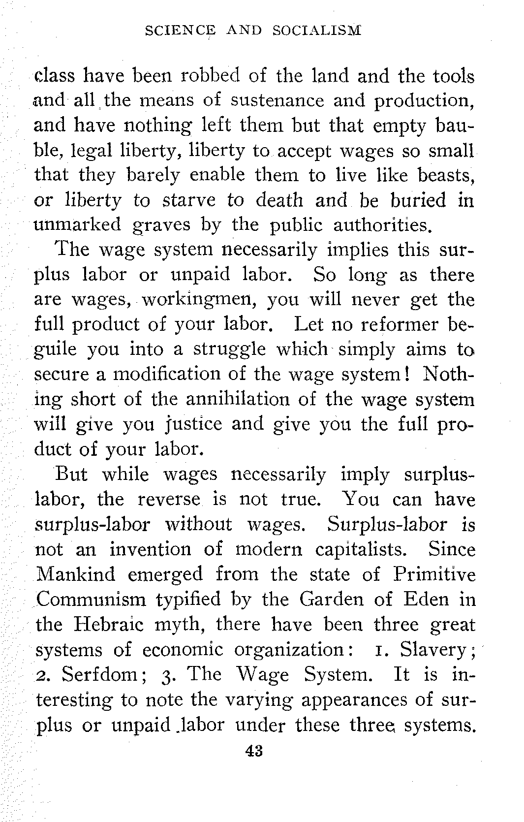 But while wages necessarily imply surplus-labor, the reverse is not true. You can have surplus-labor without wages. Surplus-labor is not an invention of modern capitalists. Since Mankind emerged from the state of Primitive Communism typified by the Garden of Eden in the Hebraic myth, there have been three great systems of economic organization: 1. Slavery; 2. Serfdom; 3. The Wage System. It is interesting to note the varying appearances of surplus or unpaid labor under these three systems.