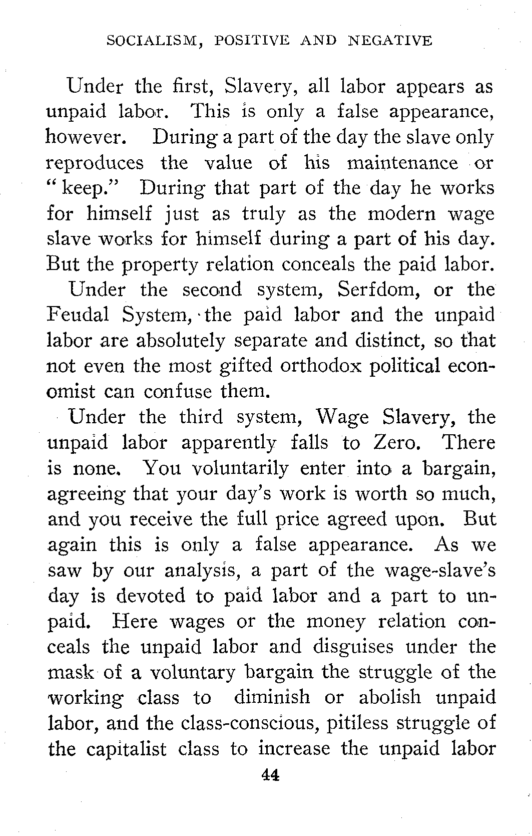 Under the third system, Wage Slavery, the unpaid labor apparently falls to Zero. There is none. You voluntarily enter into a bargain, agreeing that your day's work is worth so much, and you receive the full price agreed upon. But again this is only a false appearance. As we saw by our analysis, a part of the wage-slave's day is devoted to paid labor and a part to unpaid. Here wages or the money relation conceals the unpaid labor and disguises under the mask of a voluntary bargain the struggle of the working class to diminish or abolish unpaid labor, and the class-conscious, pitiless struggle of the capitalist class to increase the unpaid labor[45] and reduce the paid labor to the minimum, i. e., to or below the level of bare subsistence. In other words the Wage System conceals the Class Struggle.