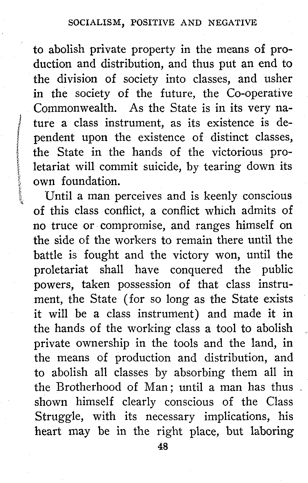 The Law of Surplus-Value has shown us that there is a deep-seated, ineradicable conflict between the direct class interest of the proletariat which coincides with the true interests of the human race, and the direct, conscious guiding interest of the class who own the means of production and distribution. There is here a direct clash between two hostile interests. This fact has been skilfully hidden from the eyes of the workers in the past, but the modern socialist movement, aided by the growing brutality of the capitalist class, is making it impossible to fool them in this way much longer. In other words, the workingmen are becoming Class-Conscious, i. e., conscious of the fact that they, as a class, have interests which are in direct conflict with the selfish interests of the capitalist class. With the growth of this class-consciousness this conflict of interests must inevitably become a political class struggle. The capitalists, the economically privileged class, struggle to retain possession of the State that they may continue to use it as a weapon to keep the working class subjugated, servile and dependent. The proletariat, the working-class, struggle to obtain possession of the State, that they may use it to destroy every vestige of economic privilege,[48] to abolish private property in the means of production and distribution, and thus put an end to the division of society into classes, and usher in the society of the future, the Co-operative Commonwealth. As the State is in its very nature a class instrument, as its existence is dependent upon the existence of distinct classes, the State in the hands of the victorious proletariat will commit suicide, by tearing down its own foundation.