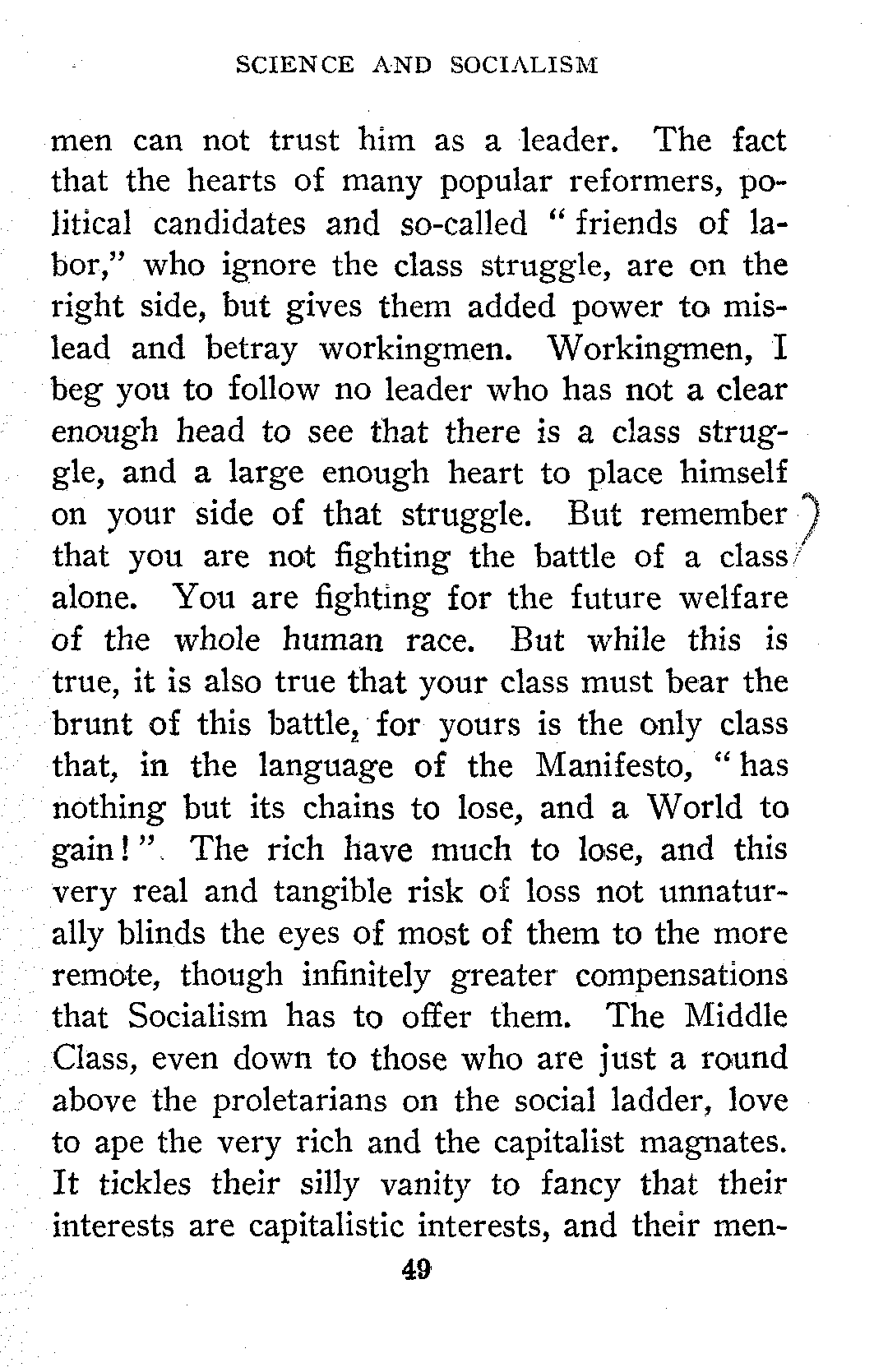 Until a man perceives and is keenly conscious of this class conflict, a conflict which admits of no truce or compromise, and ranges himself on the side of the workers to remain there until the battle is fought and the victory won, until the proletariat shall have conquered the public powers, taken possession of that class instrument, the State (for so long as the State exists it will be a class instrument) and made it in the hands of the working class a tool to abolish private ownership in the tools and the land, in the means of production and distribution, and to abolish all classes by absorbing them all in the Brotherhood of Man; until a man has thus shown himself clearly conscious of the Class Struggle, with its necessary implications, his heart may be in the right place, but laboring[49] men can not trust him as a leader. The fact that the hearts of many popular reformers, political candidates and so-called "friends of labor," who ignore the class struggle, are on the right side, but gives them added power to mislead and betray workingmen. Workingmen, I beg you to follow no leader who has not a clear enough head to see that there is a class struggle, and a large enough heart to place himself on your side of that struggle. But remember that you are not fighting the battle of a class alone. You are fighting for the future welfare of the whole human race. But while this is true, it is also true that your class must bear the brunt of this battle, for yours is the only class that, in the language of the Manifesto, "has nothing but its chains to lose, and a World to gain!" The rich have much to lose, and this very real and tangible risk of loss not unnaturally blinds the eyes of most of them to the more remote, though infinitely greater compensations that Socialism has to offer them. The Middle Class, even down to those who are just a round above the proletarians on the social ladder, love to ape the very rich and the capitalist magnates. It tickles their silly vanity to fancy that their interests are capitalistic interests, and their [50]mental horizon is too hopelessly limited for them to perceive that the proletariat whom it pleases them to despise as the great army of the "unwashed" are in truth fighting their battles for them, and receiving instead of gratitude, contempt, gibes and sneers. Socialism does occasionally receive a recruit from the very highest stratum of society, but I tell you it is easier for a camel to pass through the eye of a needle than it is for a member of the Middle Class to become a scientific socialist.