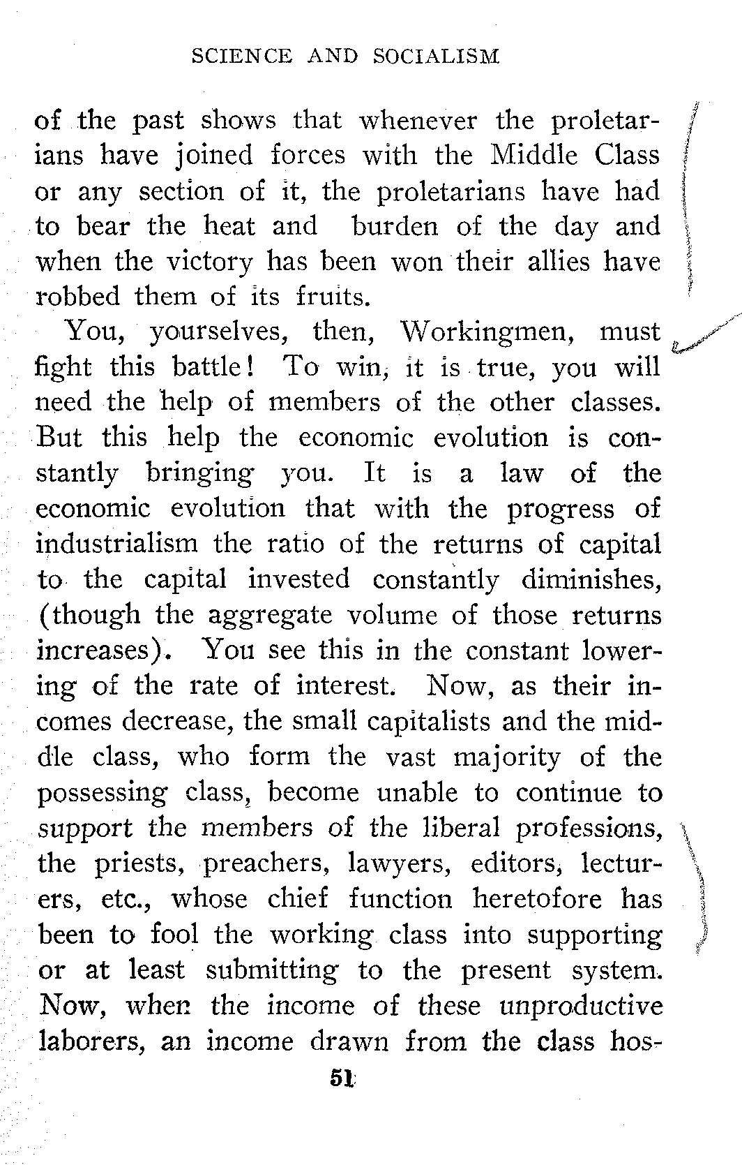 You, yourselves, then, Workingmen, must fight this battle! To win, it is true, you will need the help of members of the other classes. But this help the economic evolution is constantly bringing you. It is a law of the economic evolution that with the progress of industrialism the ratio of the returns of capital to the capital invested constantly diminishes, (though the aggregate volume of those returns increases). You see this in the constant lowering of the rate of interest. Now, as their incomes decrease, the small capitalists and the middle class, who form the vast majority of the possessing class, become unable to continue to support the members of the liberal professions, the priests, preachers, lawyers, editors, lecturers, etc., whose chief function heretofore has been to fool the working class into supporting or at least submitting to the present system. Now, when the income of these unproductive laborers, an income drawn from the class [52]hostile to the proletariat, shall sensibly decrease or, worse still, cease, these educated members of the liberal professions will desert the army of Capital and bring a much-needed reinforcement to the Army of Labor.